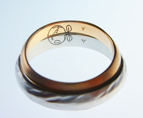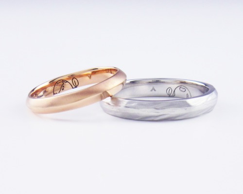 幅を大きくとった作品になります。左のリングは奥様のリング。ピンクゴールド素材。