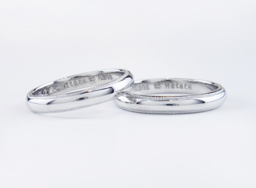 シンプルな結婚指輪。指輪上下にミル打ち加工を施しています。