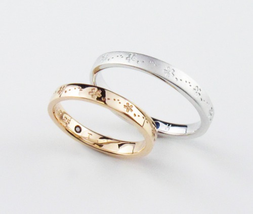 桜柄が全面に入ったオリジナルの結婚指輪。