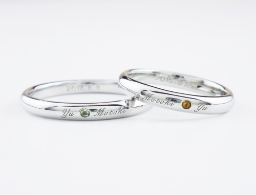 指輪の外側にお互いの名前を入れたとこと、お互いの誕生石を入れたとこ。