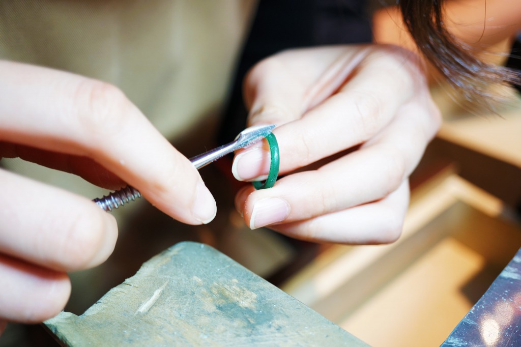 指輪の厚み・幅を整えている作業中。
