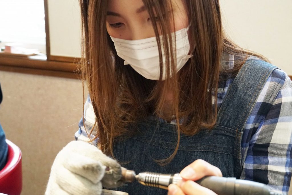 ワックスと違い、金属は熱がこもってしまうので、軍手を付けて作業いただきました。