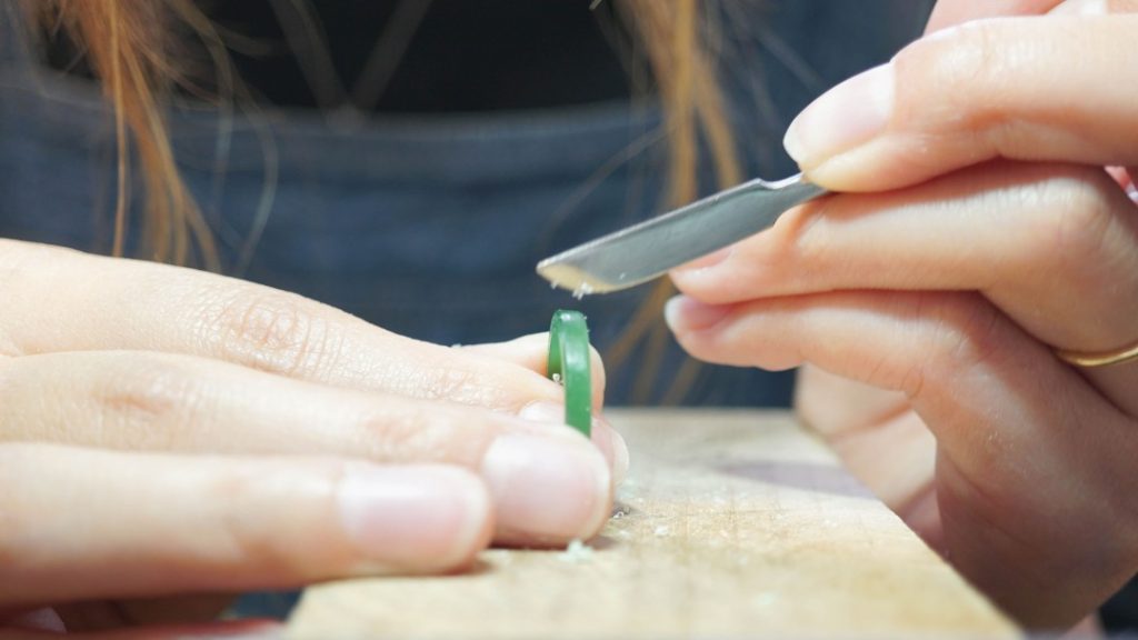 ナイフのような工具で指輪原型の表面を整えていきました。