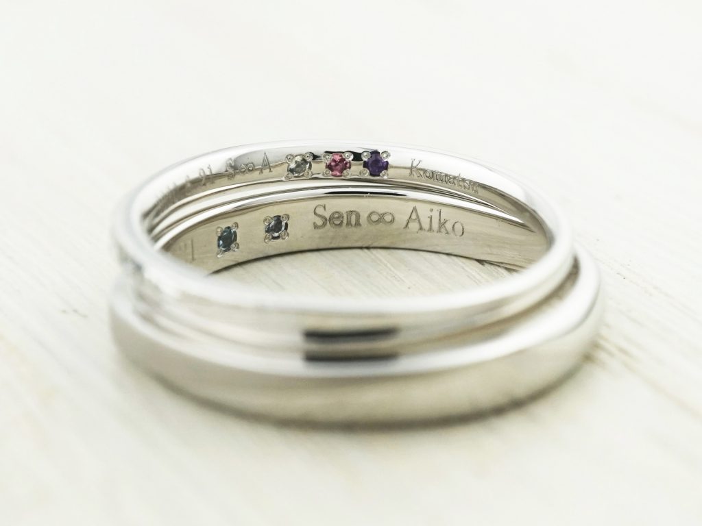Men’sリングにはお二人の記念の日付と名前の刻印。