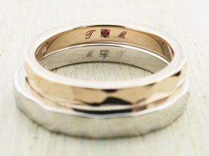 内側には筆記体でお互いのイニシャルと誕生石を留めています。