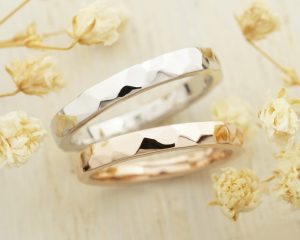 ゆるい鎚目模様を加えた結婚指輪です。