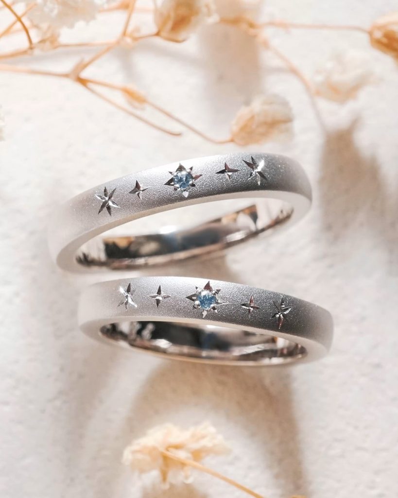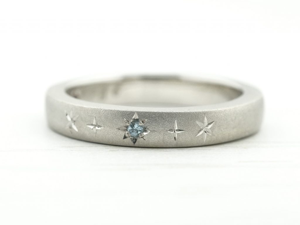 アクアマリンを留めた星彫り加工のストレートリング
