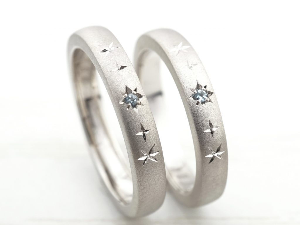 5つの星彫り、中央の星にアクアマリンを留めています。