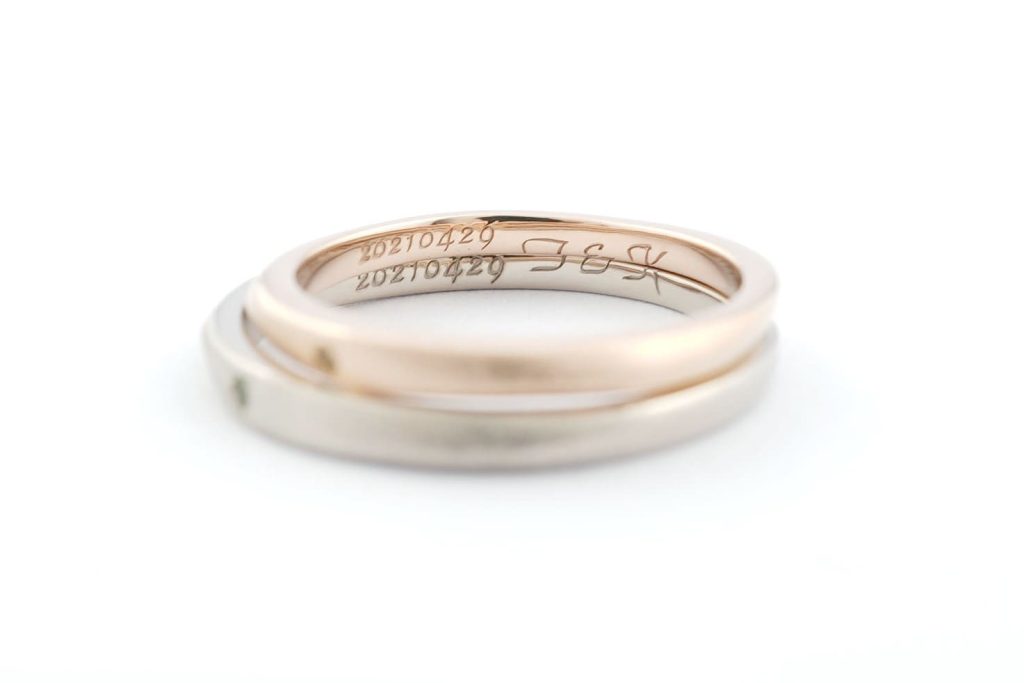 指輪の内側には記念日と、ふたつ合わせることで完成する