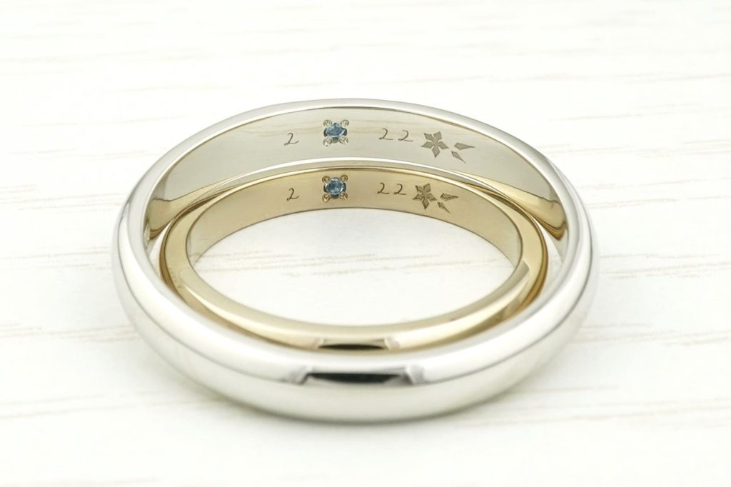 指輪の内側にはおふたりの誕生石アクアマリンを留め、