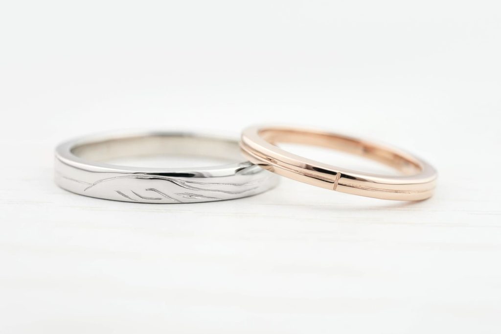 メンズリング(画像左)はプラチナ素材を使用し、