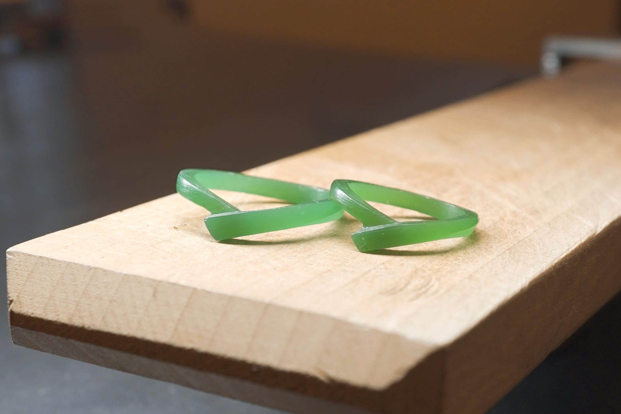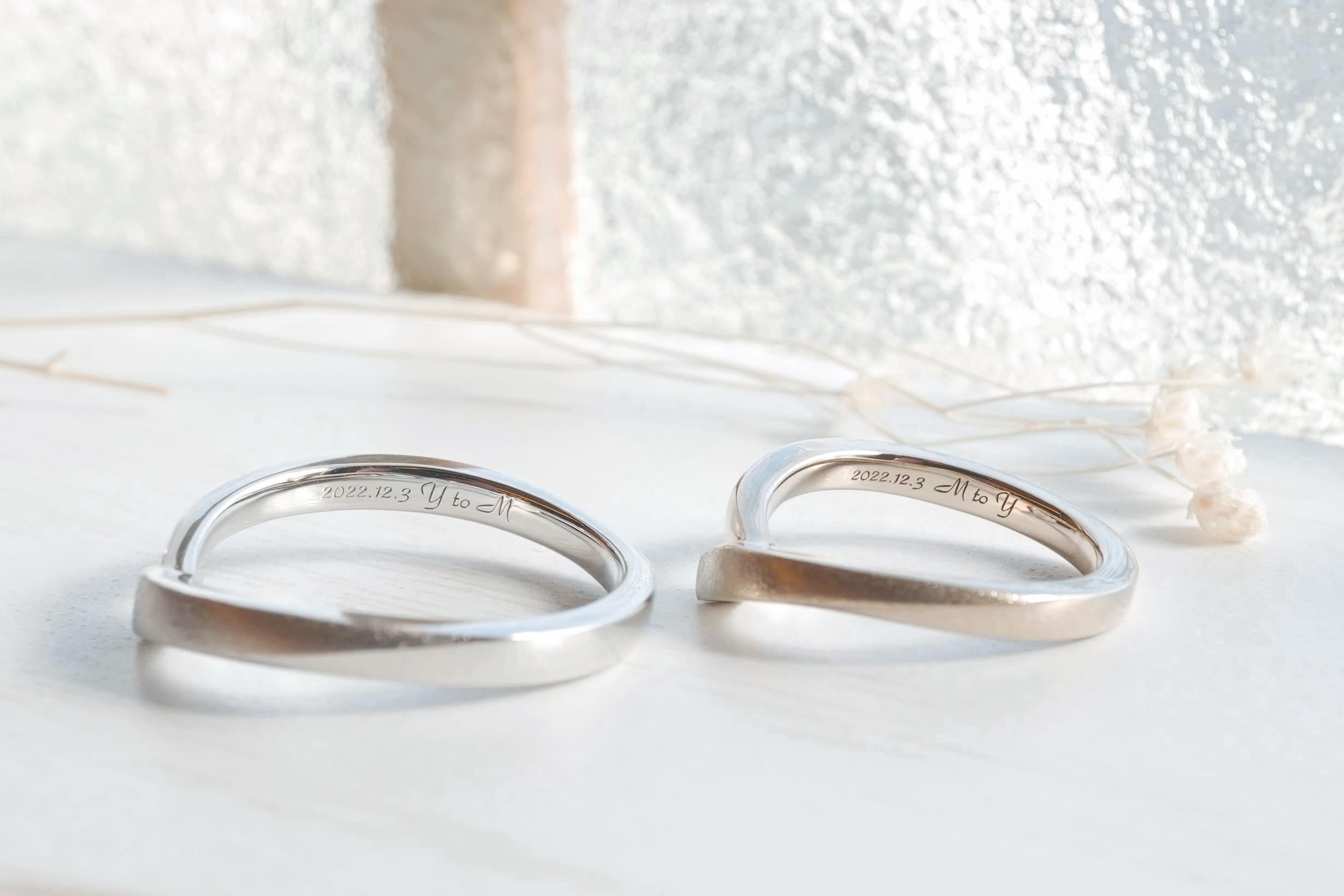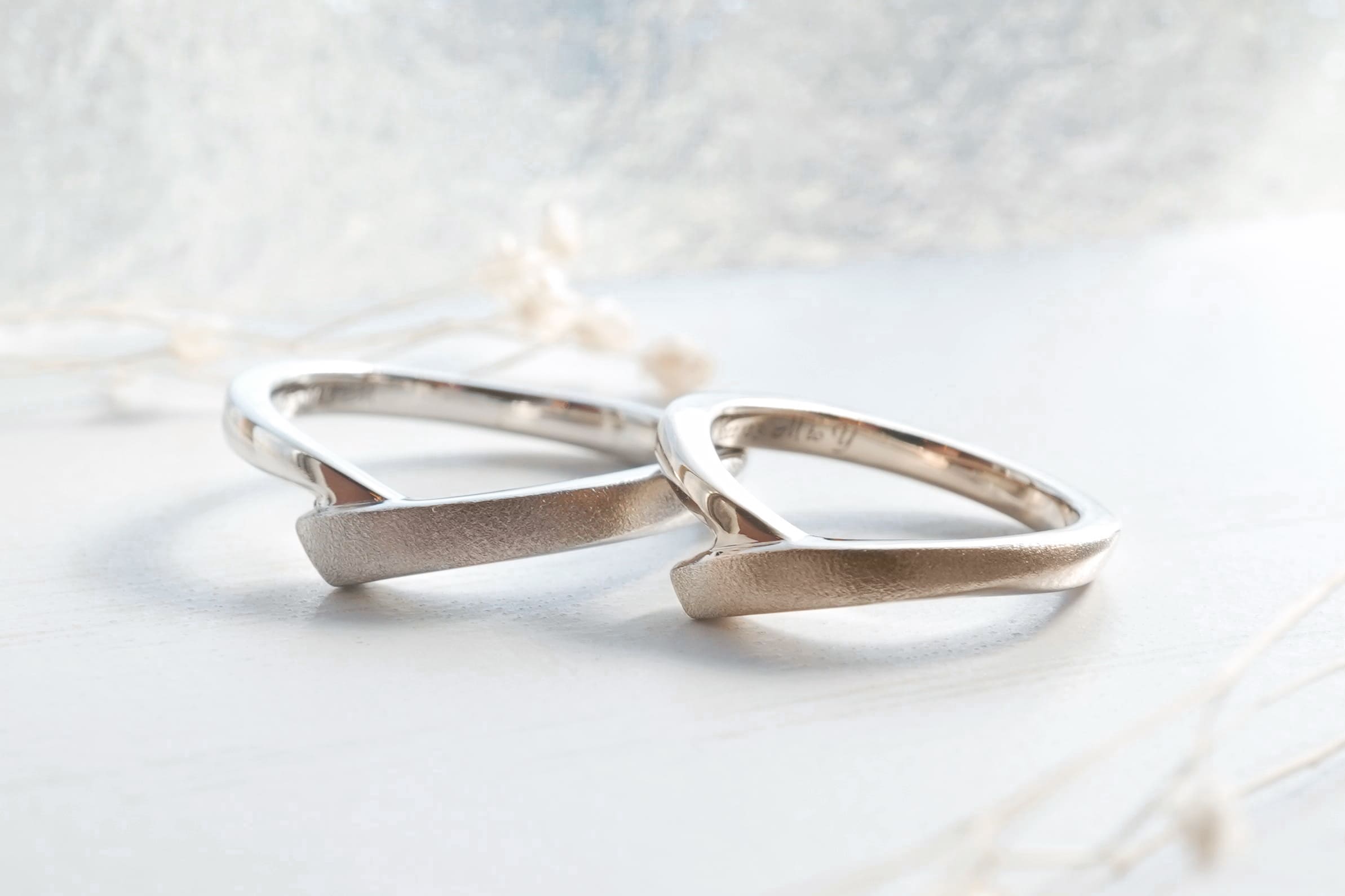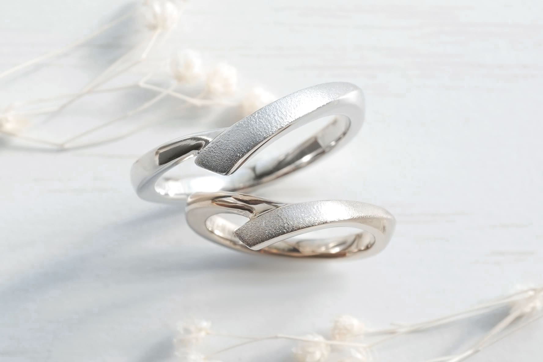 おふたりとも片側が飛び出たV字デザインの指輪を