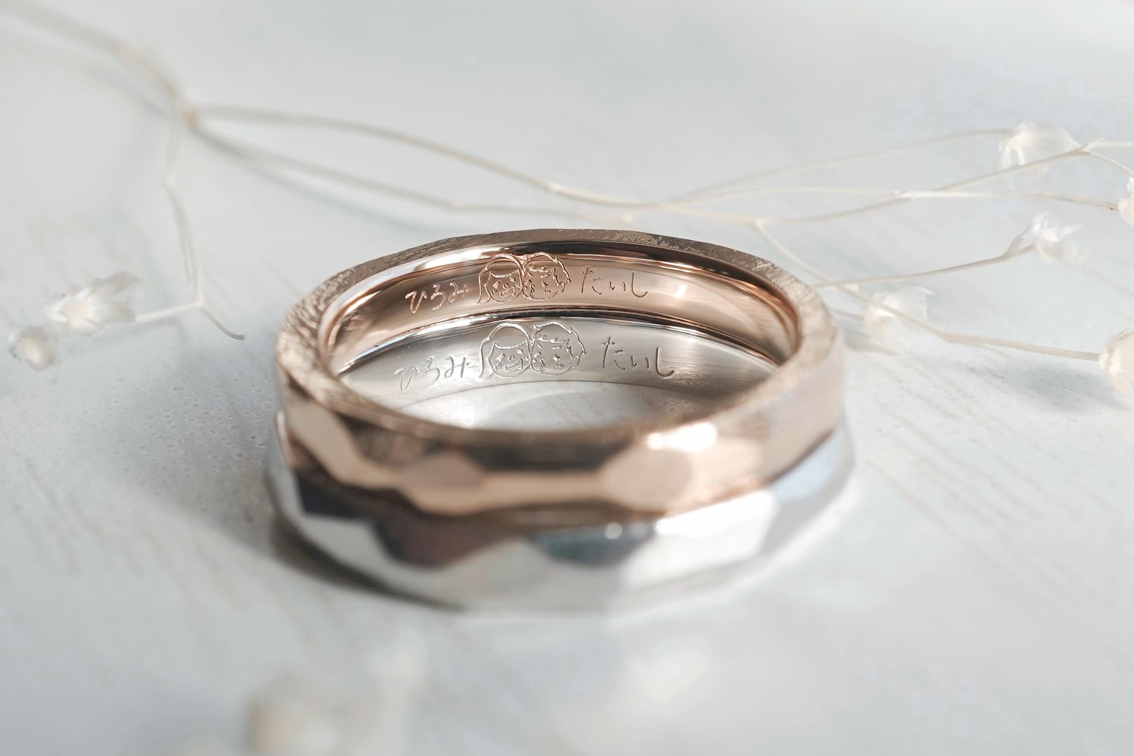 指輪の内側には、おふたりのお名前と似顔絵が