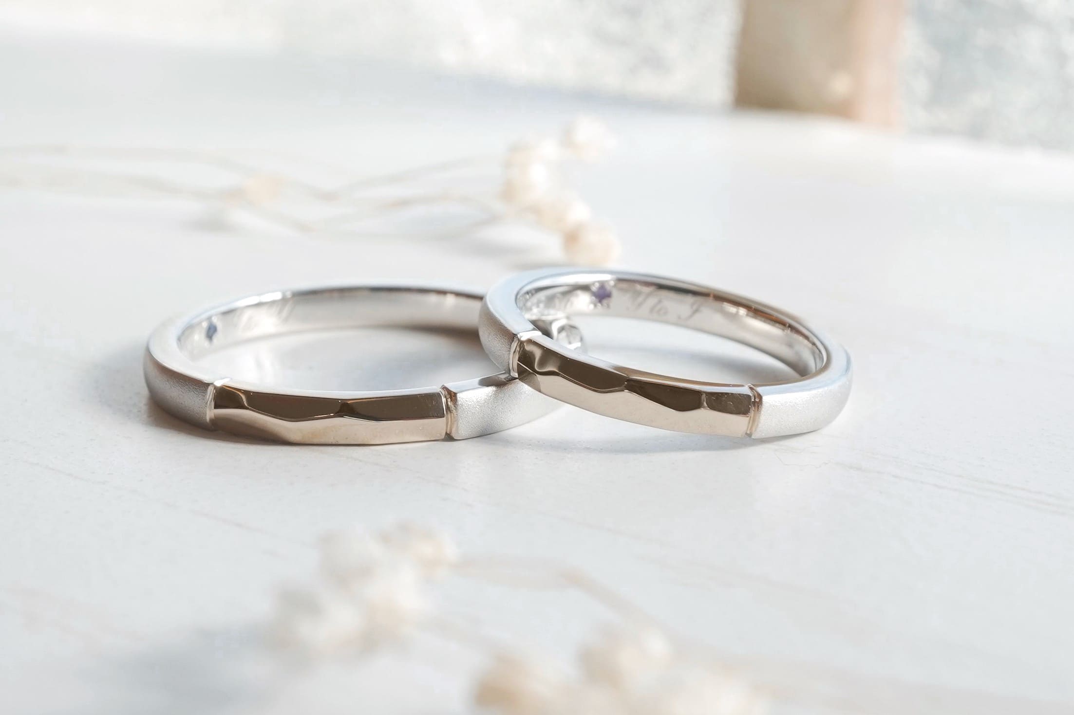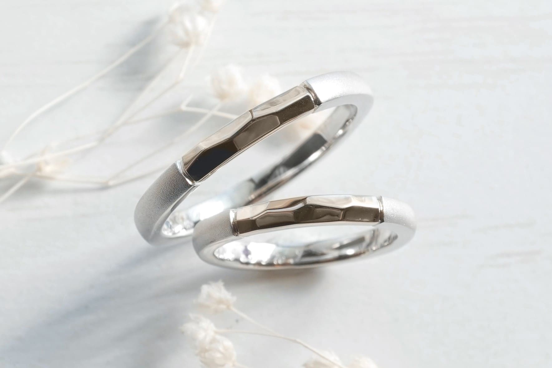 素材と表面加工に変化を持たせた手作り結婚指輪