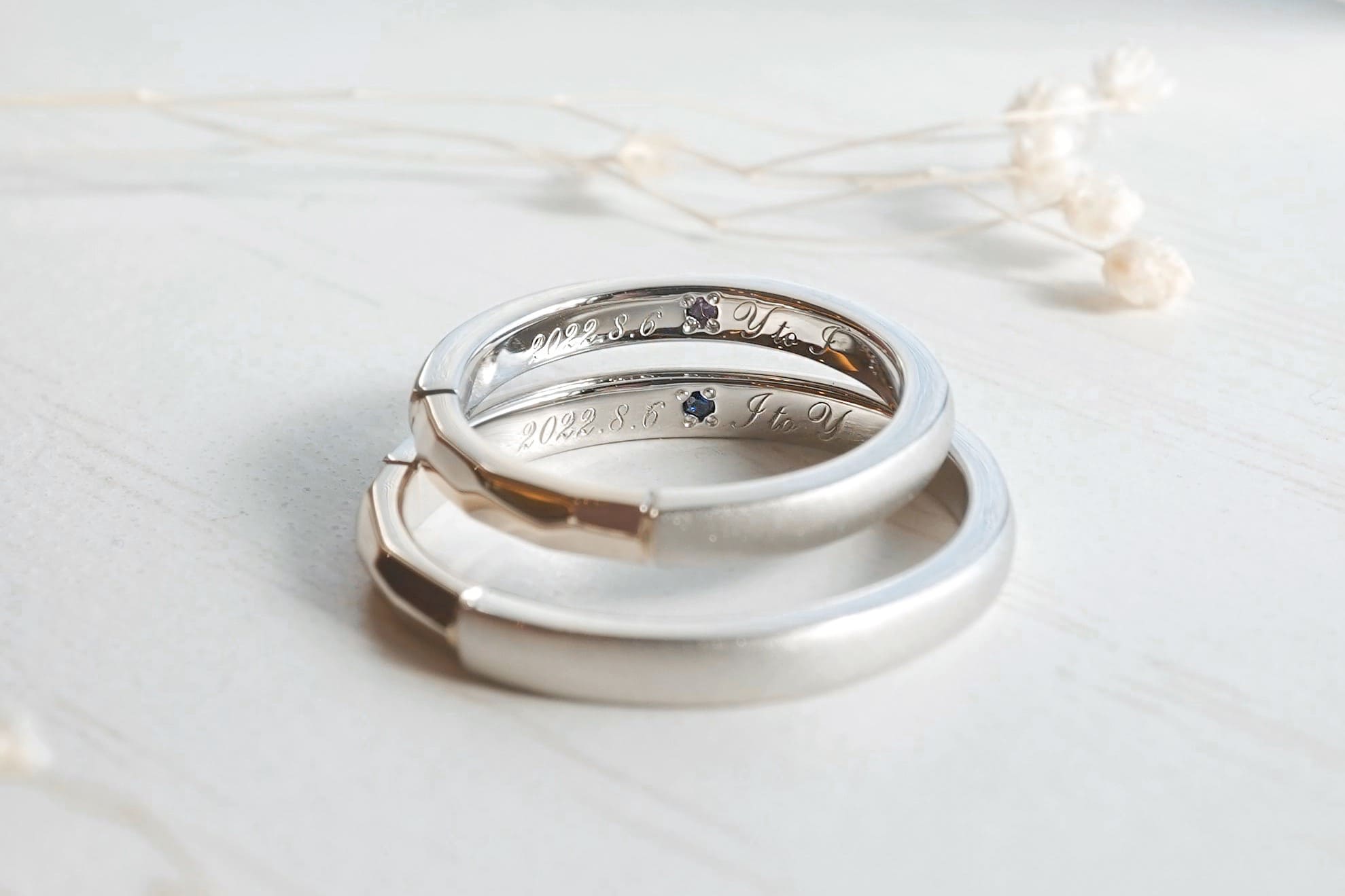 指輪の内側には、大切な記念日とイニシャルを