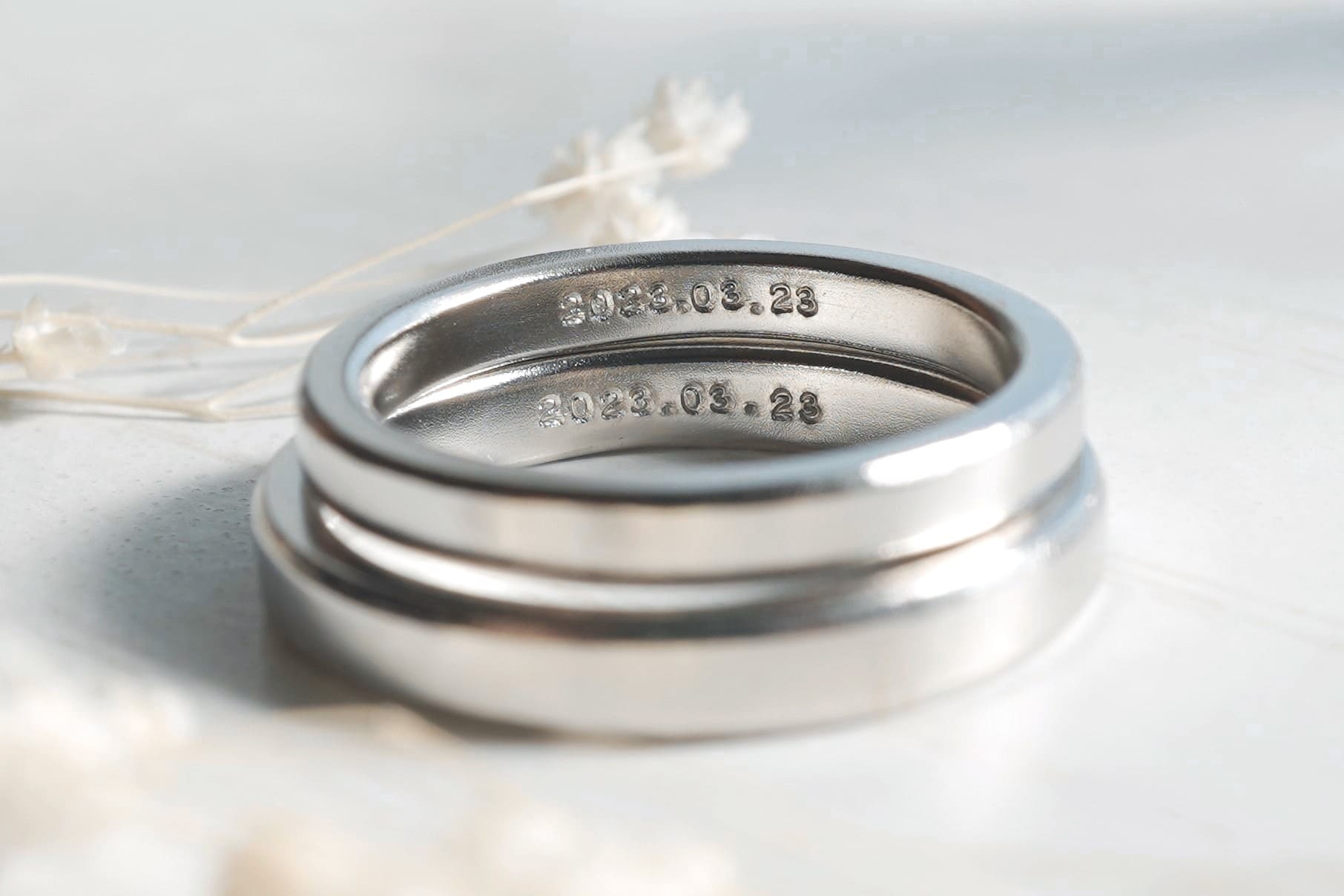 打刻文字でおふたりの記念日が刻印されています。