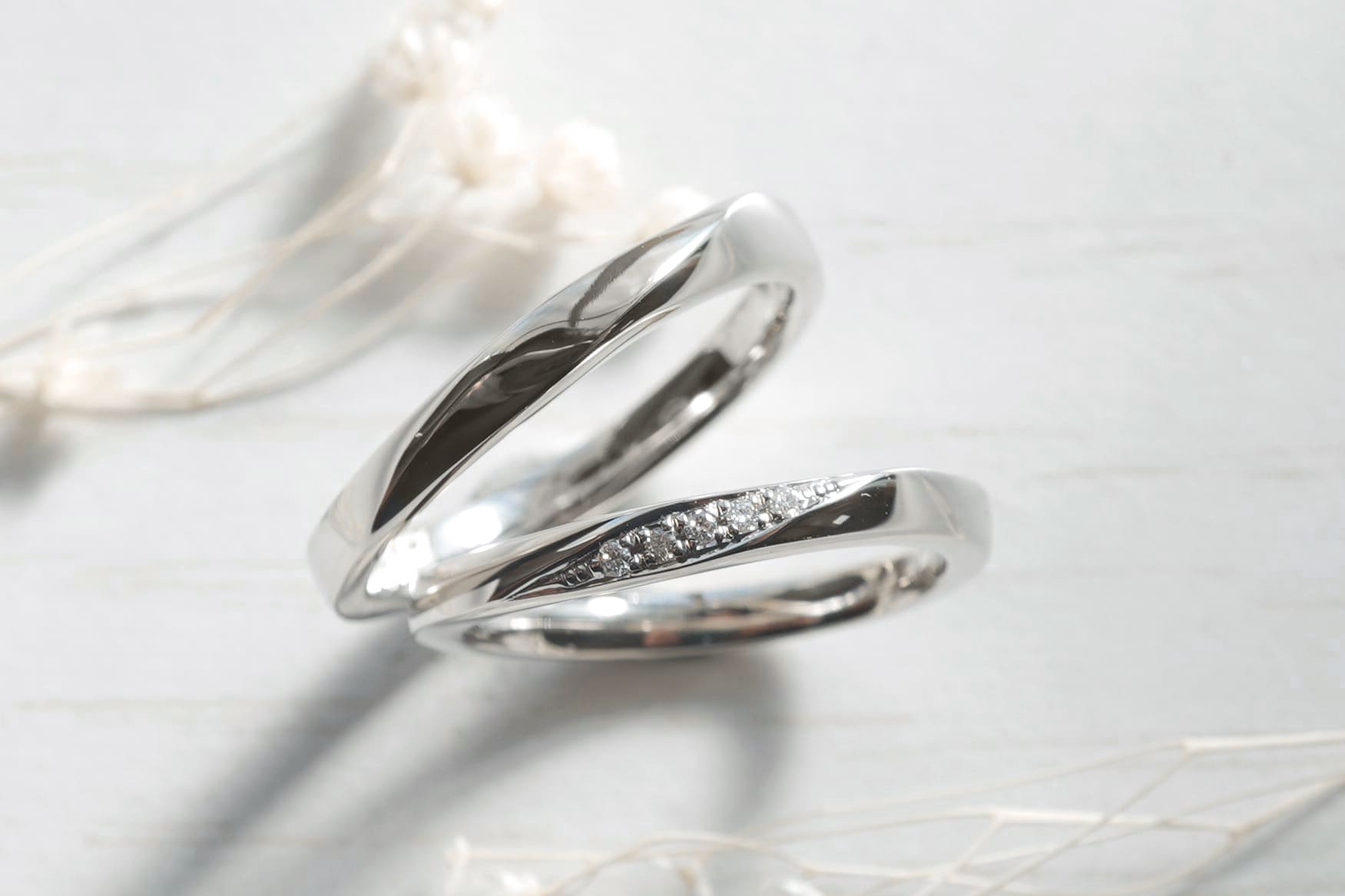 少しウェーブを付けひねりを加えたデザインの結婚指輪を