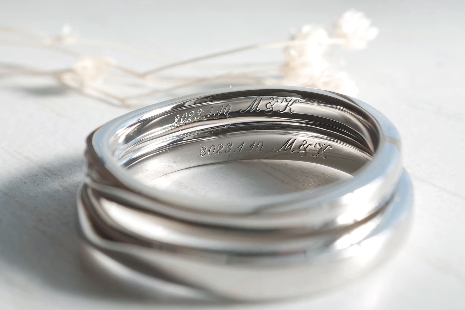 指輪の内側にはおふたりの記念日、イニシャルが