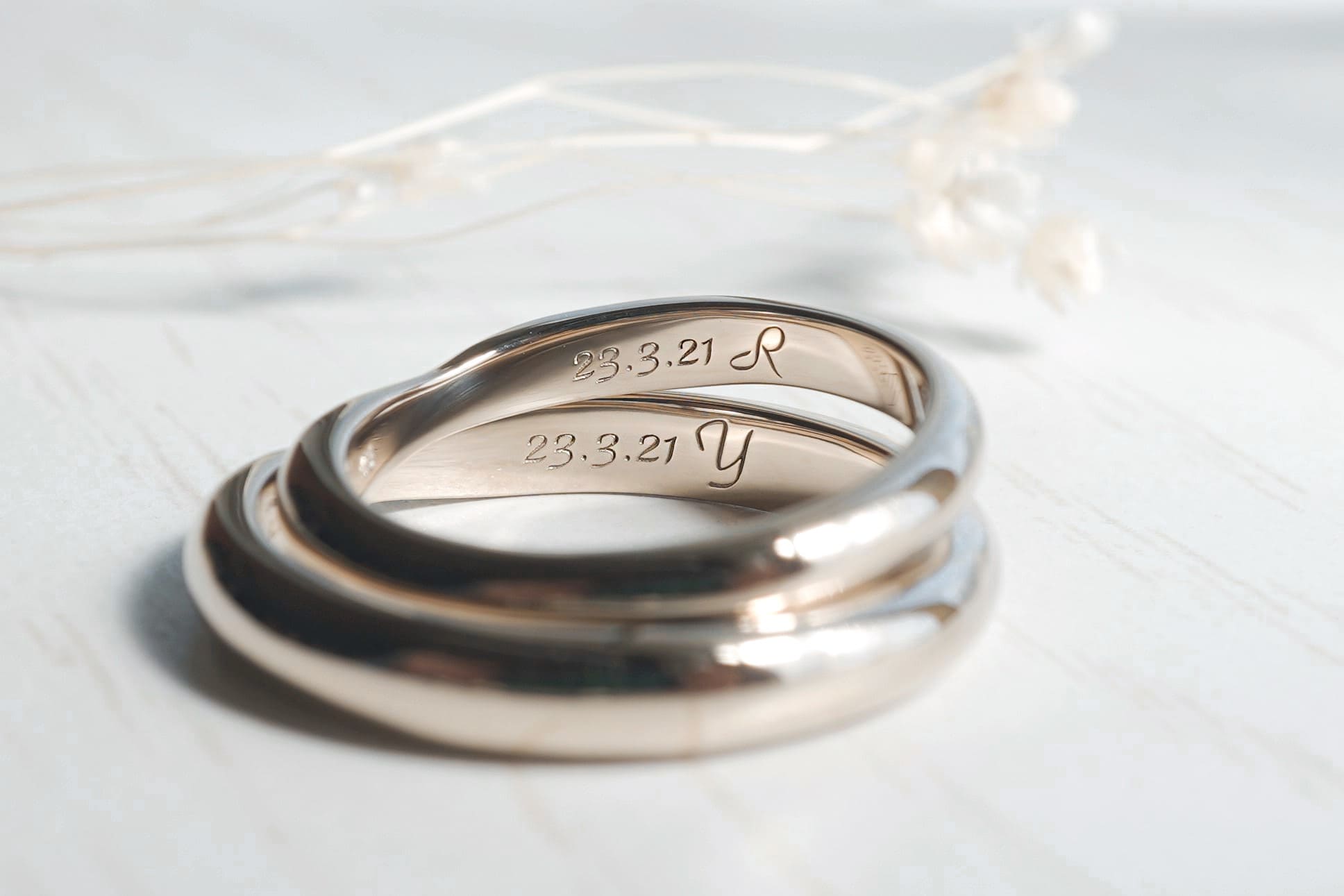 指輪の内側には、おふたりの記念日とイニシャルが