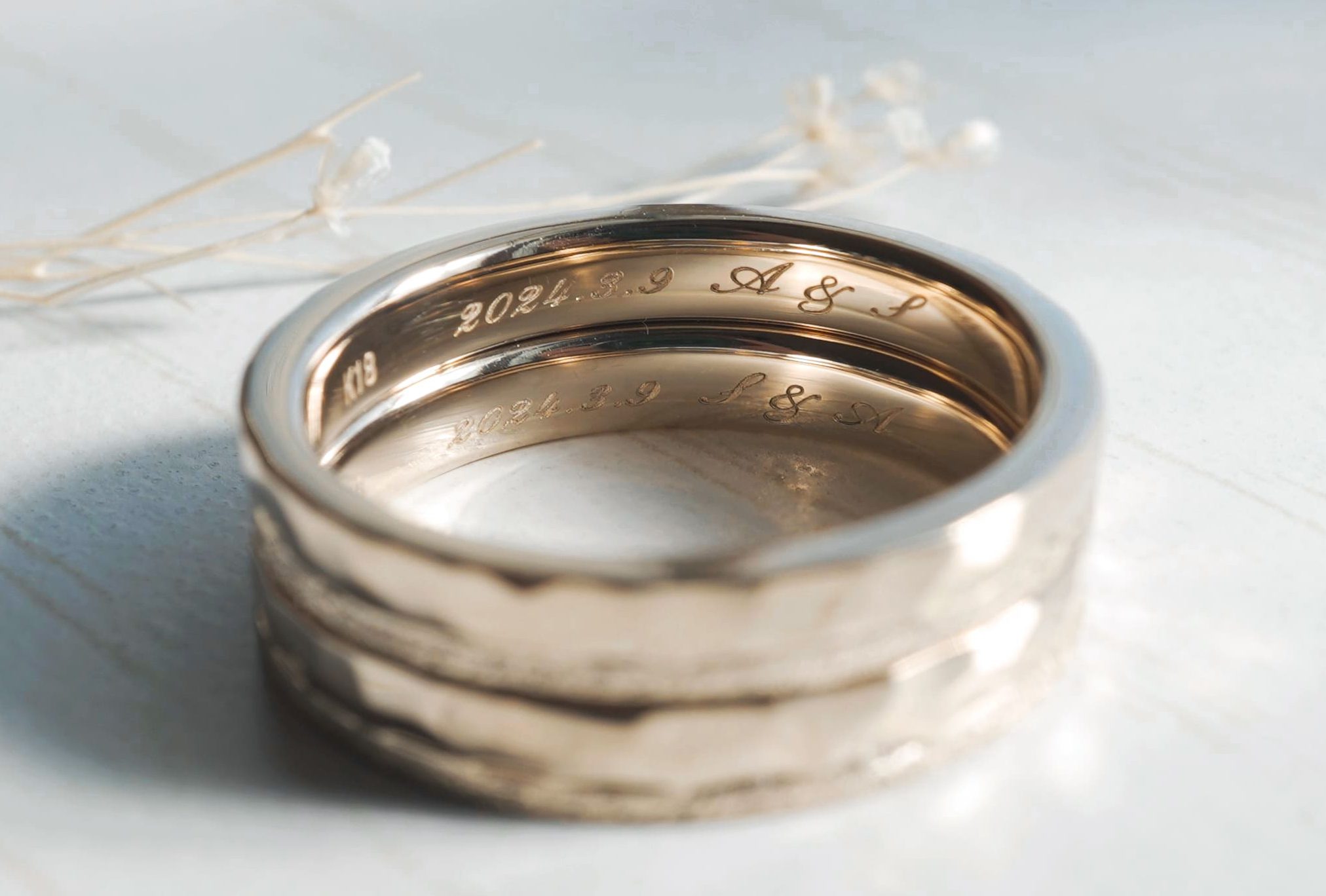 指輪の内側にはおふたりの記念日とイニシャルを