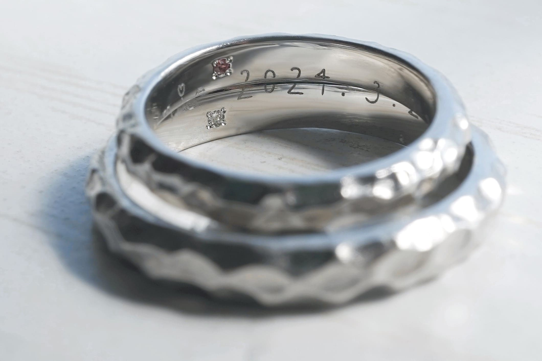 指輪の内側には、手書き文字で記念日とおふたりの名前が