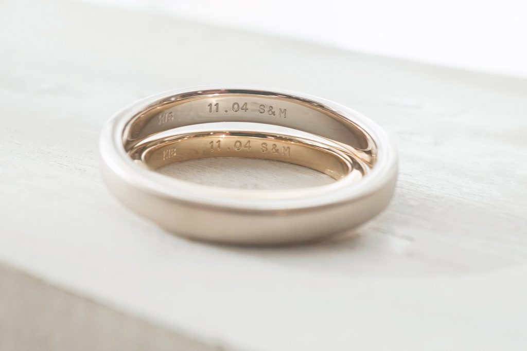 内側には記念日とおふたりのイニシャルを打刻文字にて刻印しています。