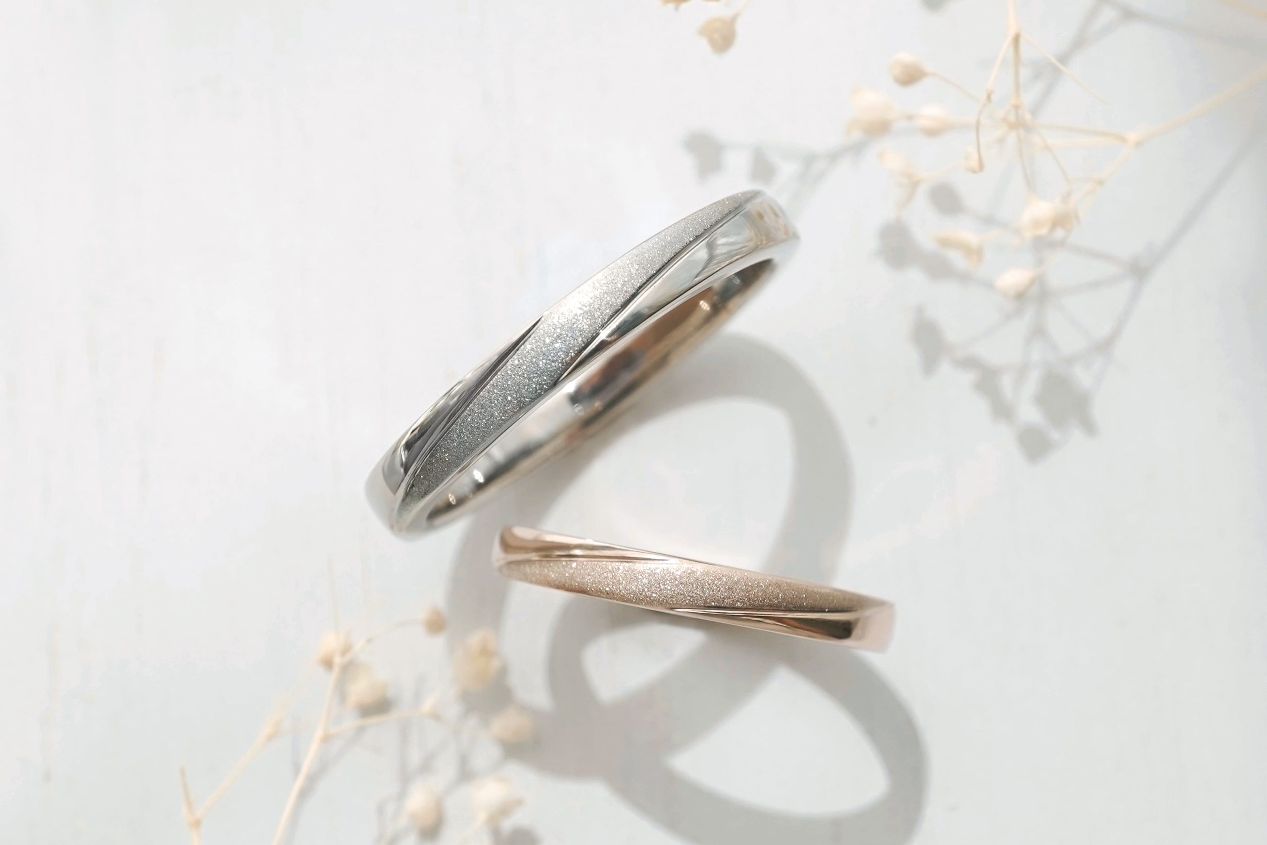 落ち着いた色味の中に、ダイヤモンドパウダー加工が映える素敵な手作り結婚指輪に仕上がりました。