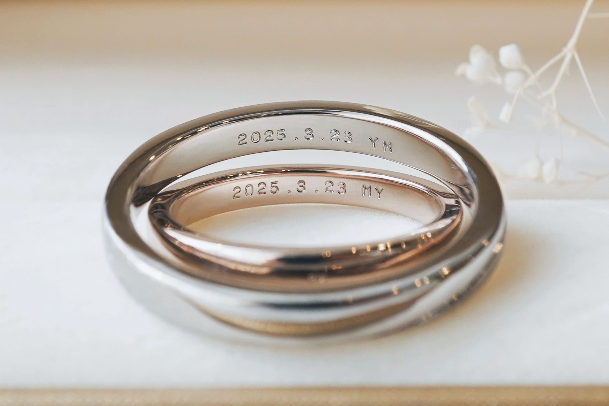 内側にはおふたりの記念日とイニシャルを刻印しております。