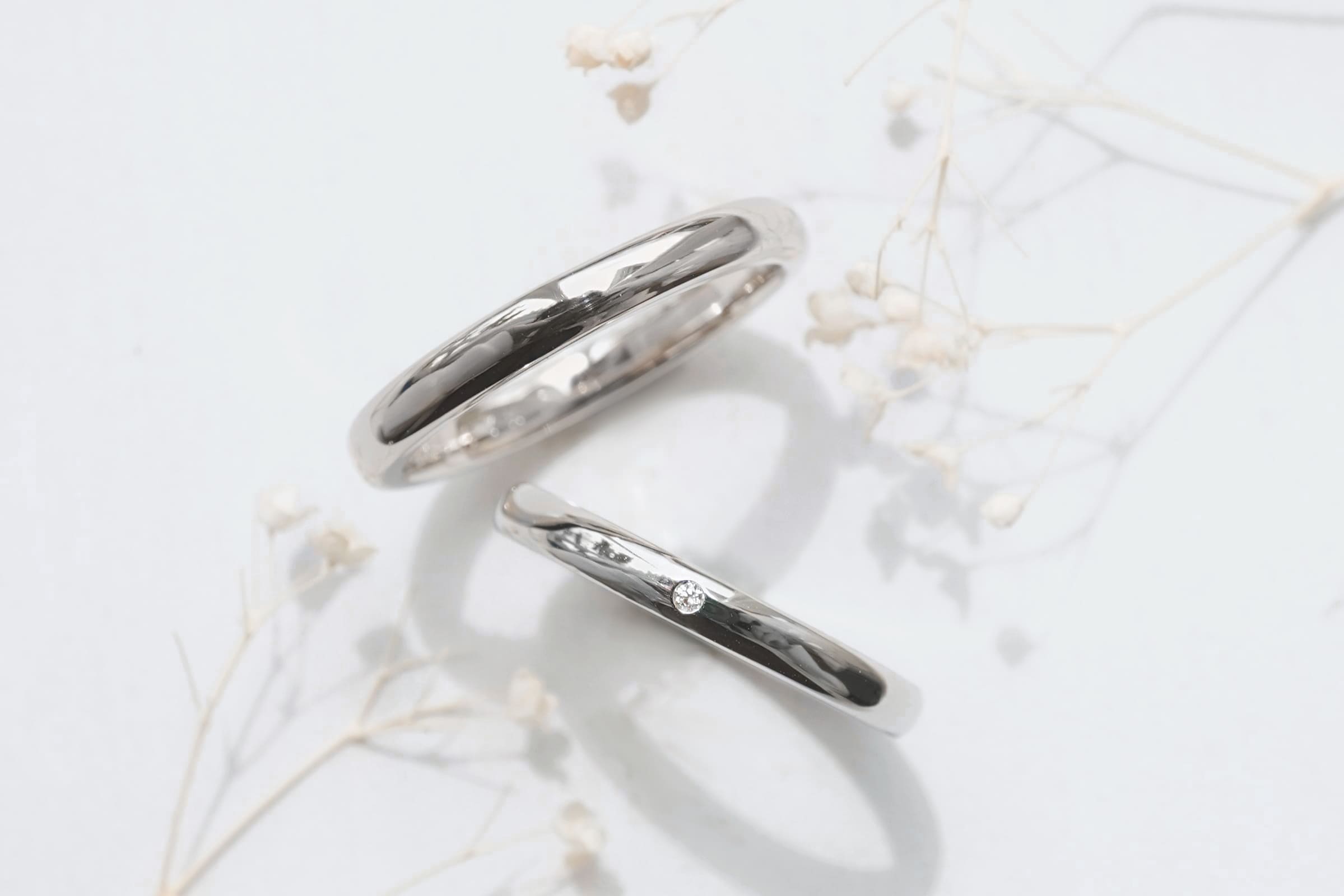 men’sリング・lady’sリング共に全面鏡面仕上げ、lady’sリングにはホワイトダイヤを1石留めて仕上げました。