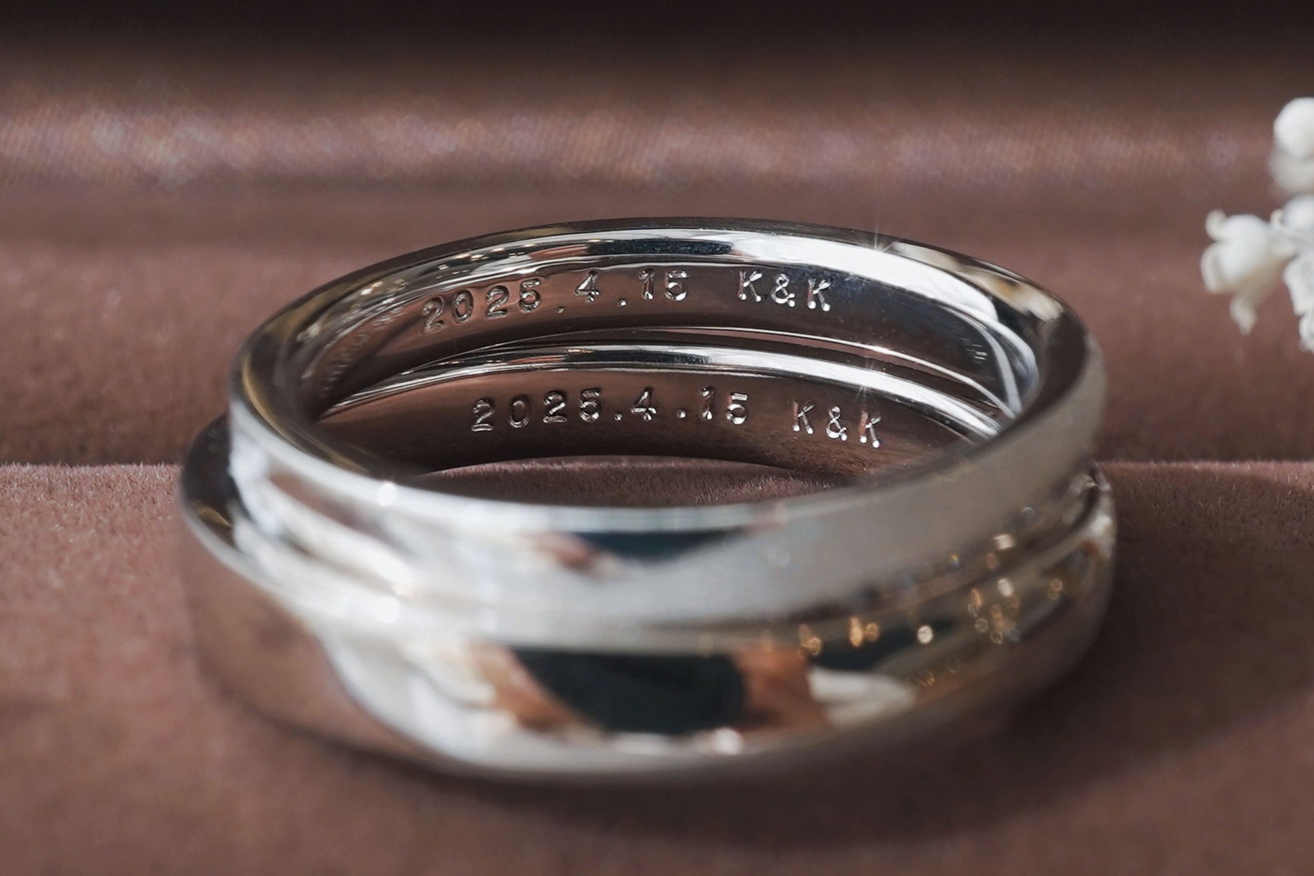 指輪の内側には、おふたりの記念日とイニシャルが打刻にて刻印されています。