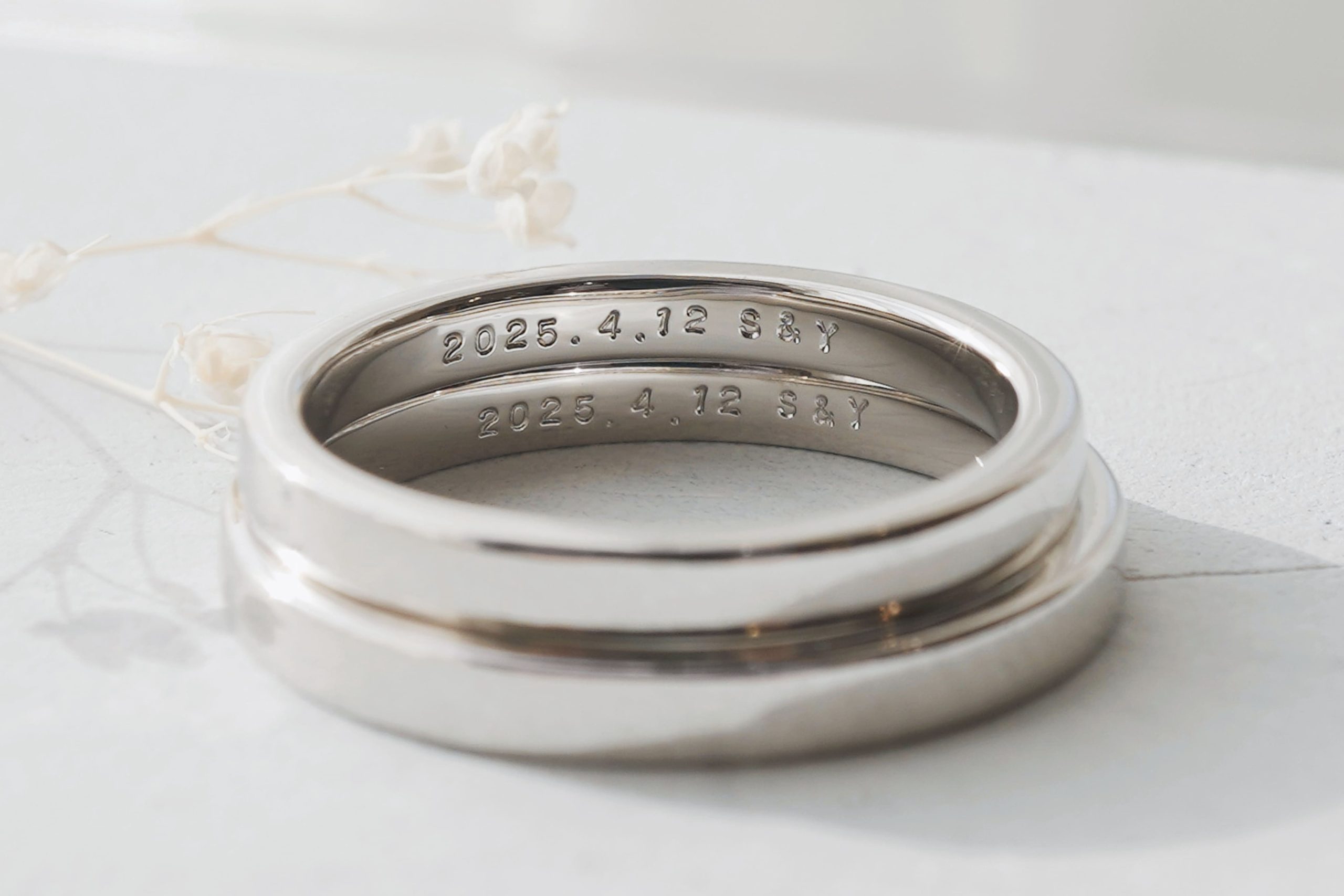 内側にはおふたりの記念日とイニシャルを打刻で入れて仕上げております。