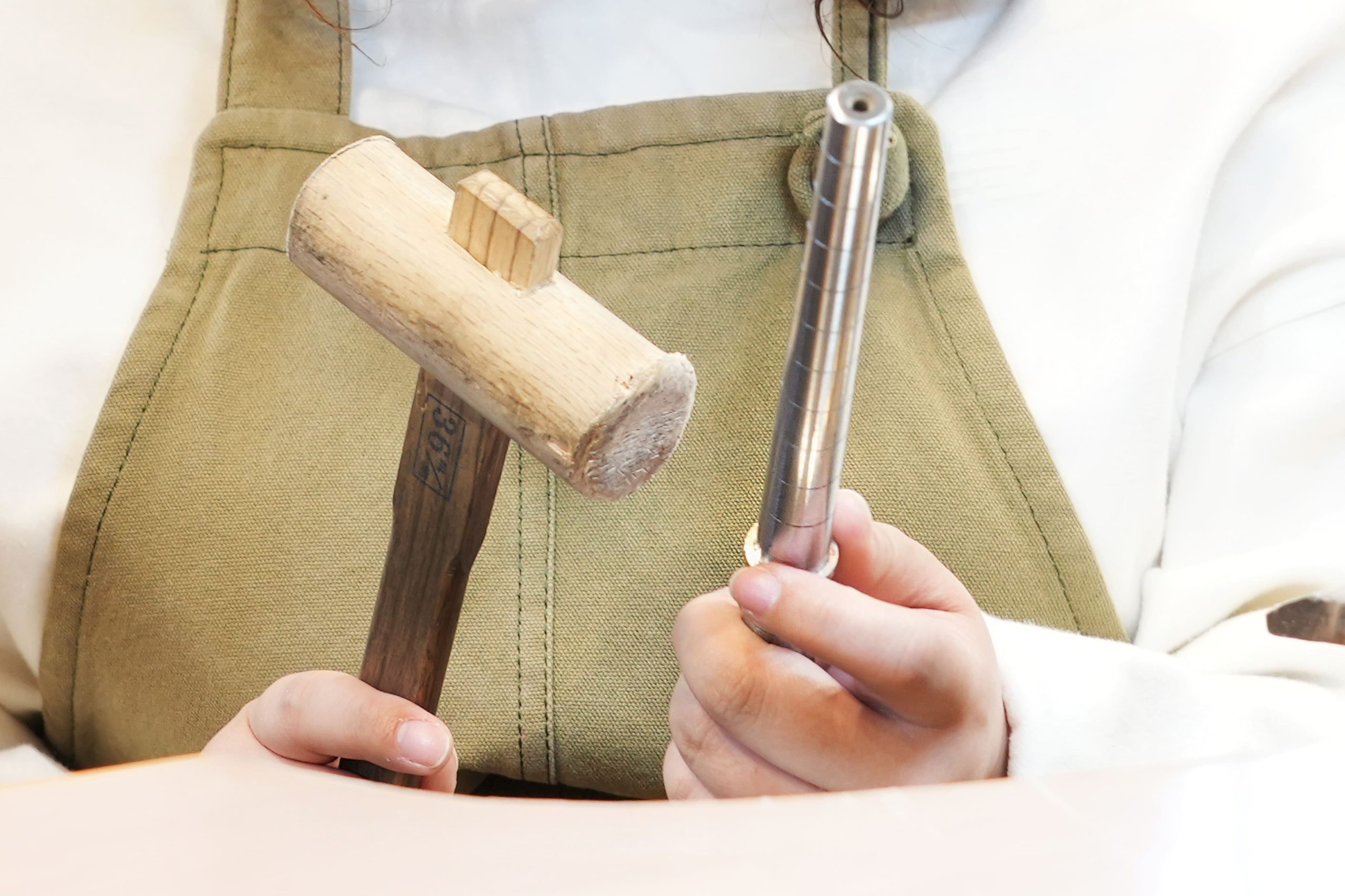 真円棒は下に行くほど太くなっているため、木槌で叩きながら下ろしていき、号数を調整します。