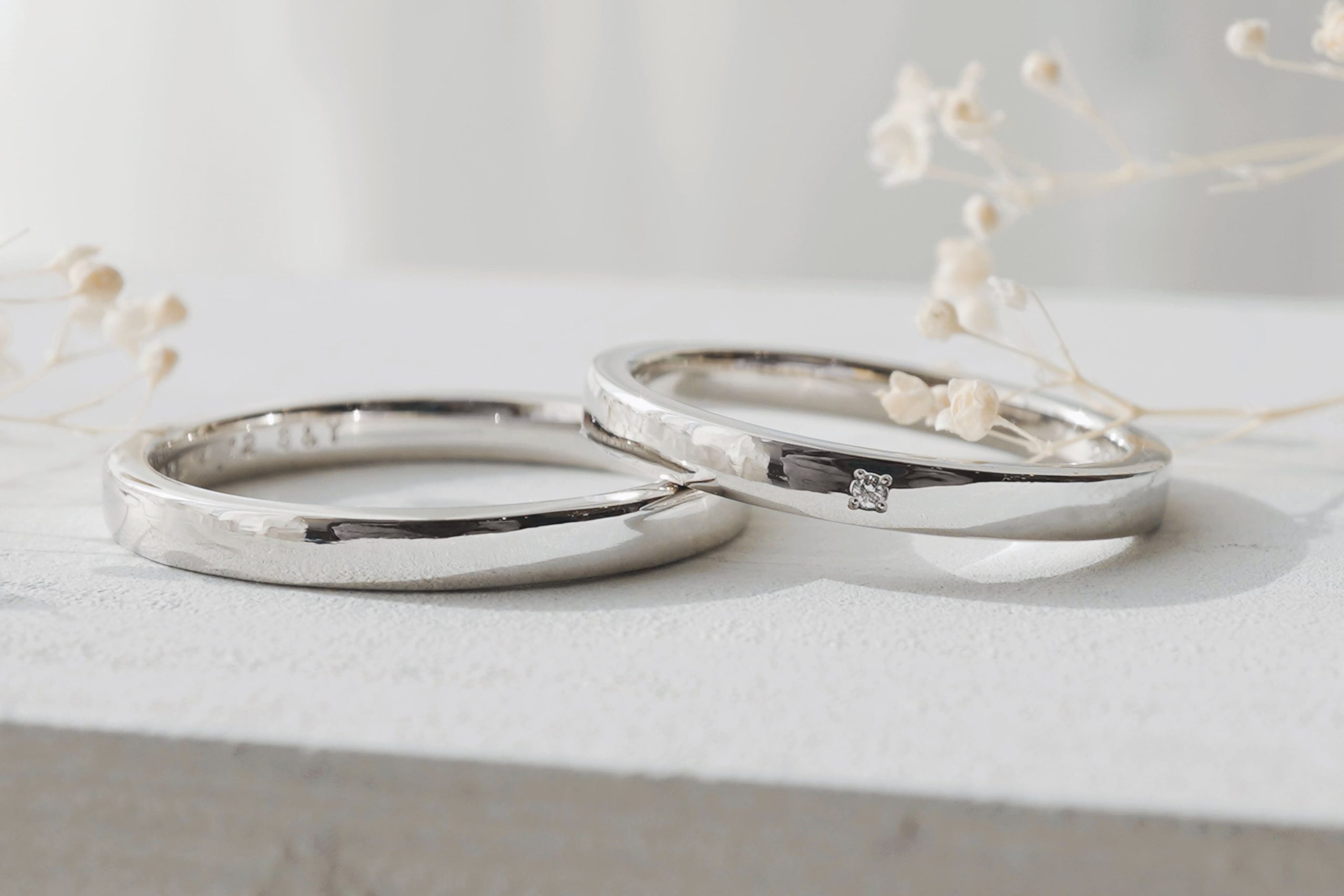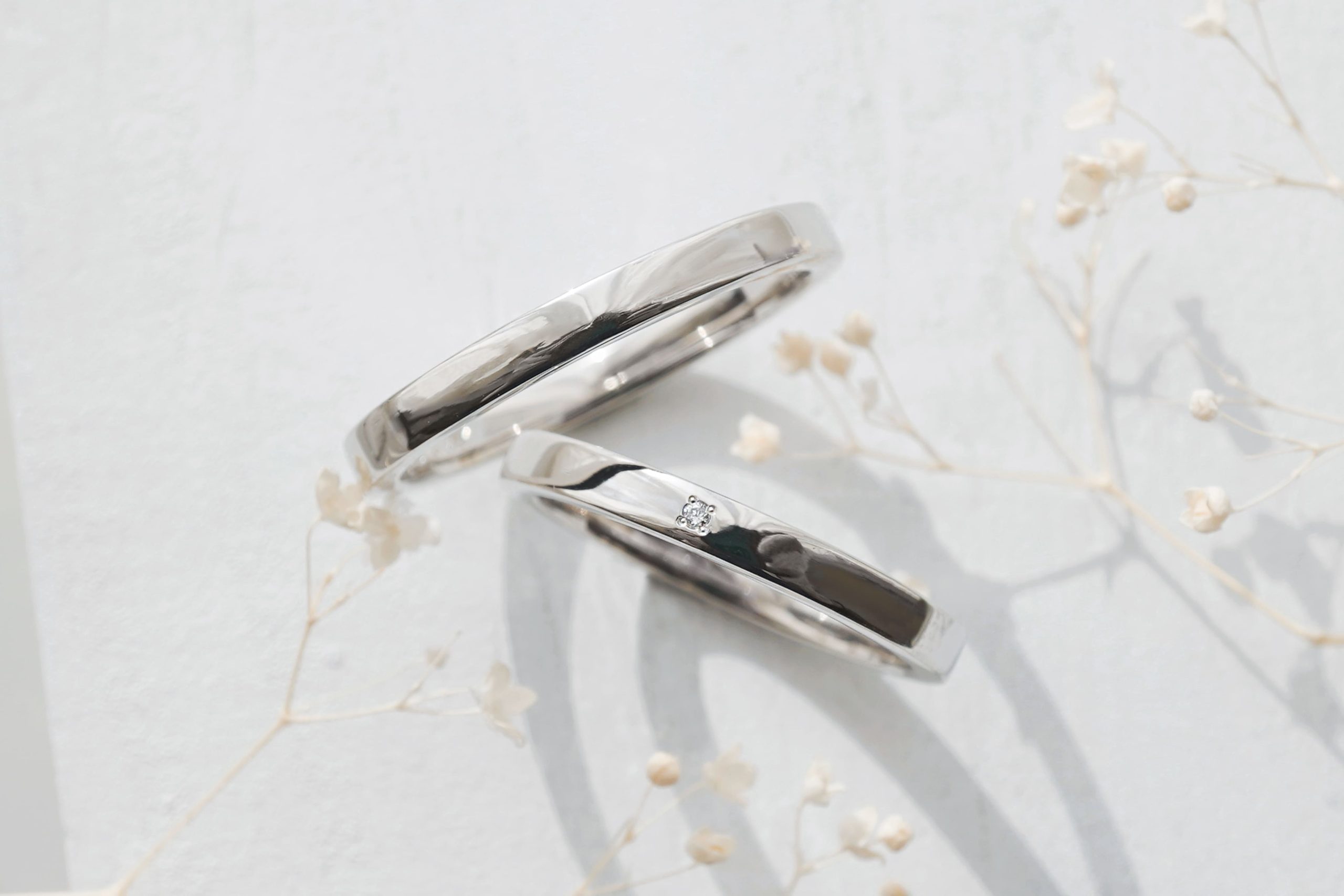 表面はおふたりとも鏡面仕上げで、lady’sリングにはホワイトダイヤを一石留めております。