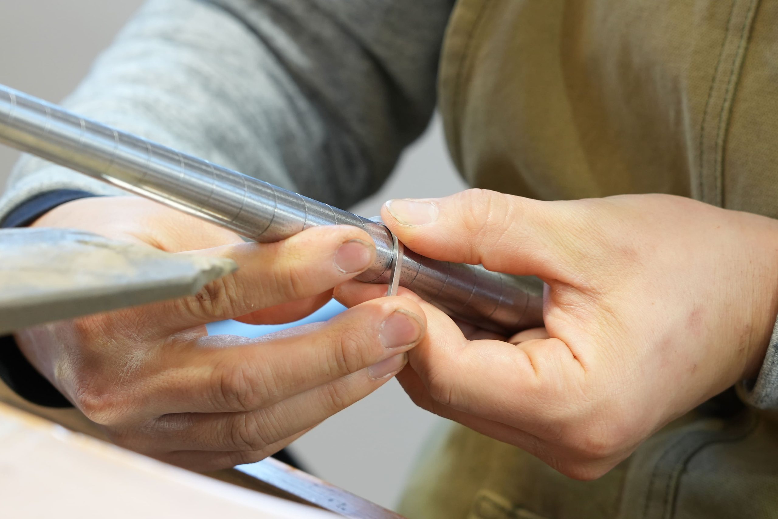 円形に曲げた金属の端同士をつなげる際、つなぎ目となる部分の凹凸を無くしている様子。