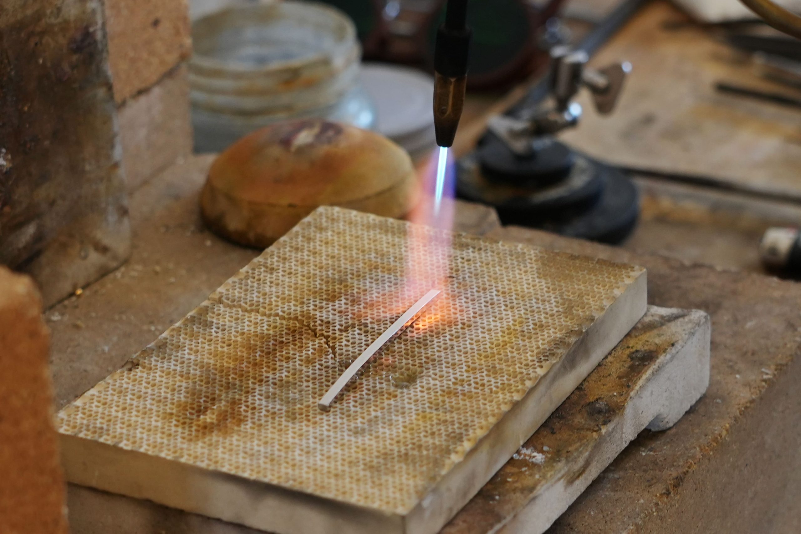 切り出した金属素材をバーナーで熱し、なましている様子。