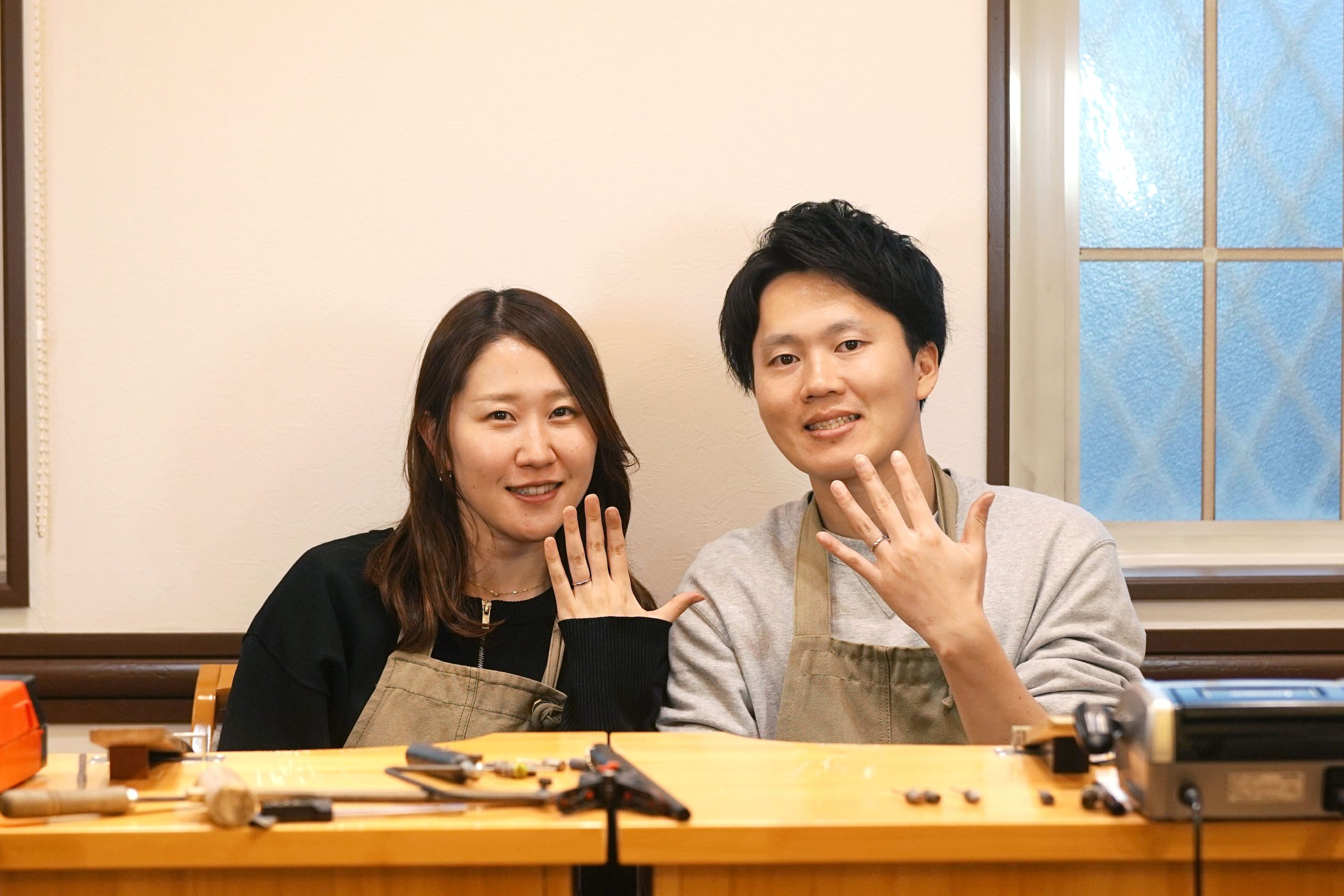 磨き終わったら表面加工を施し、おふたりの手作り結婚指輪が完成しました。