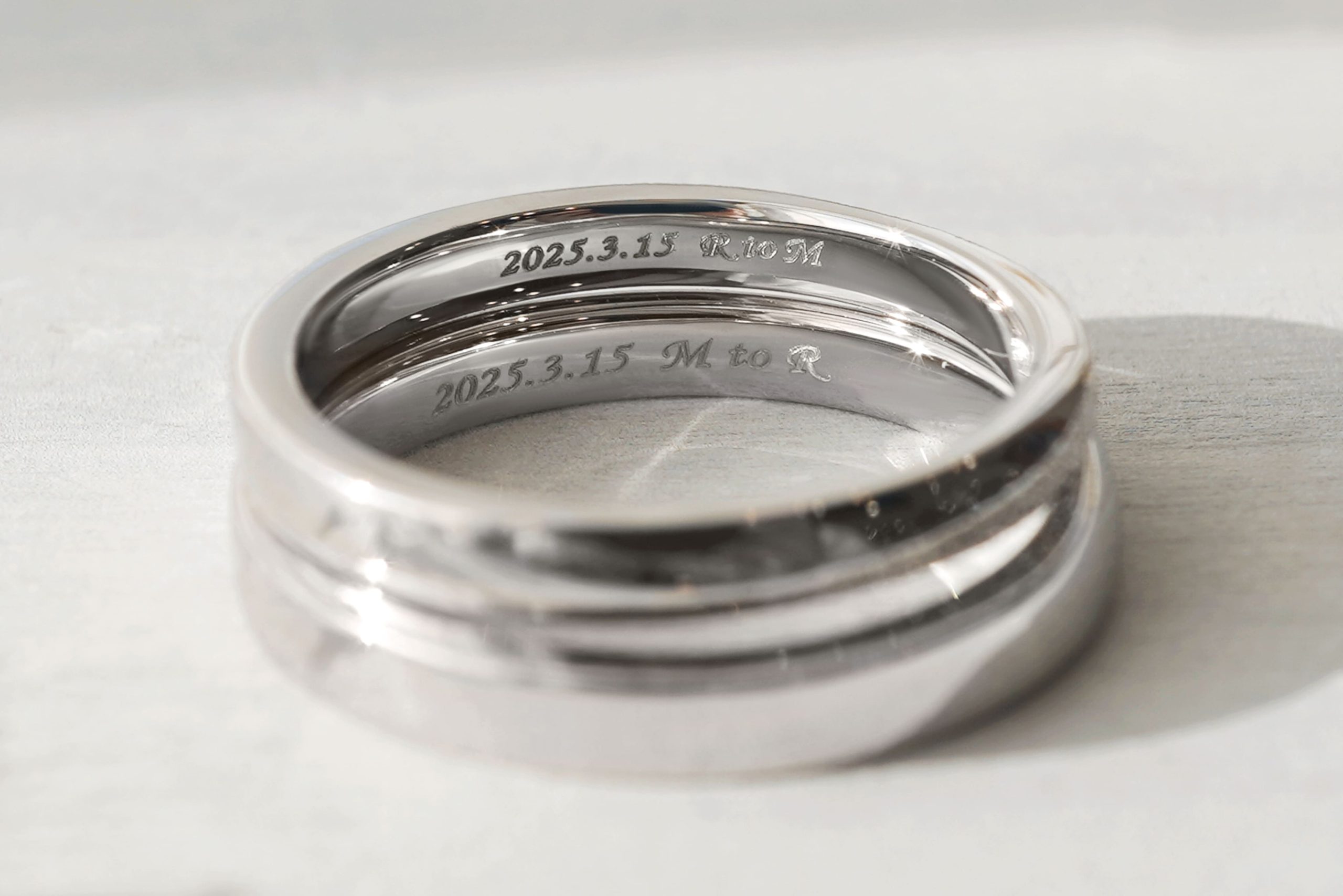 指輪の内側には、おふたりの記念日とイニシャルがレーザーにて刻印されています。
