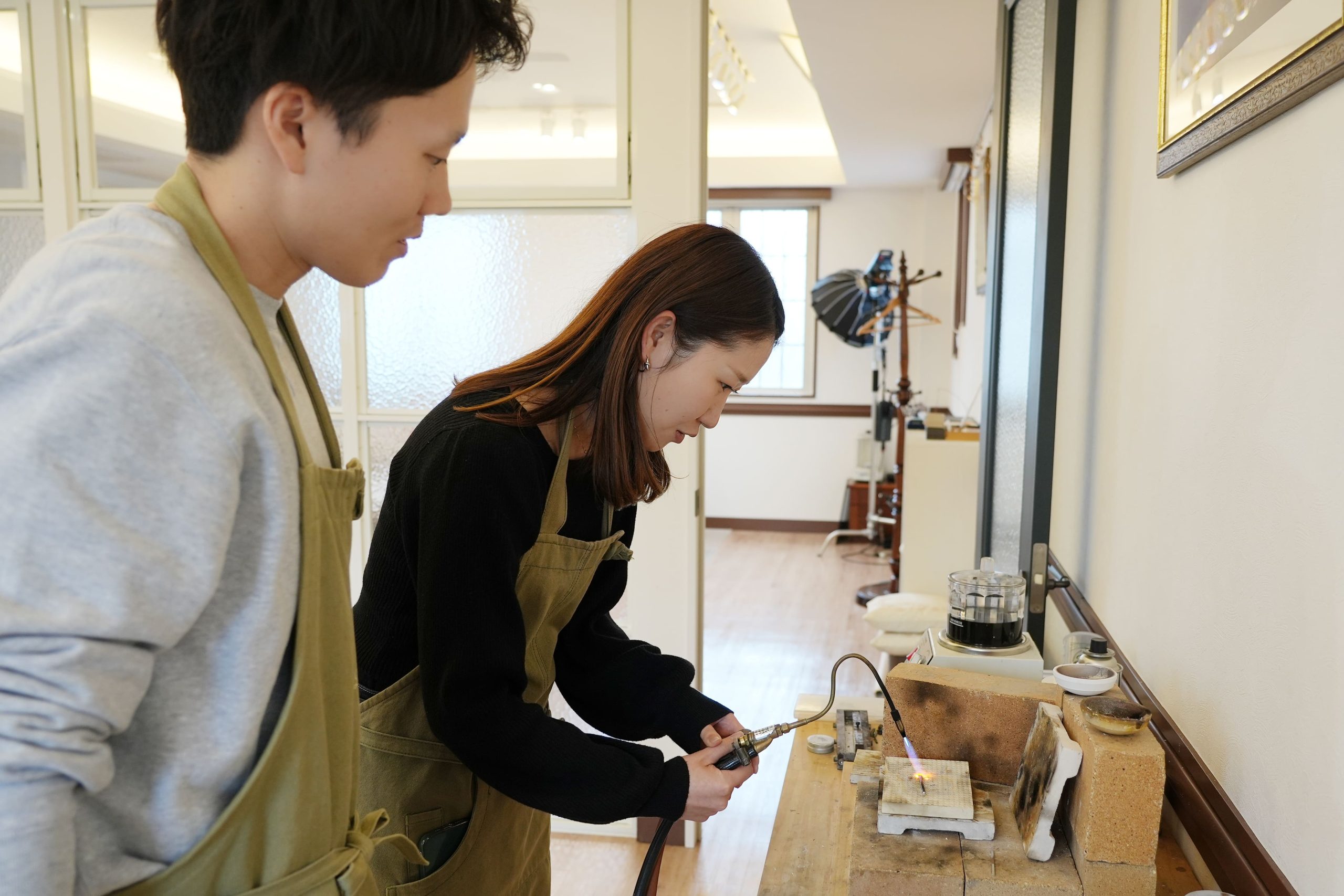 切り出したPt900の角線をバーナーで熱し、なましている様子。