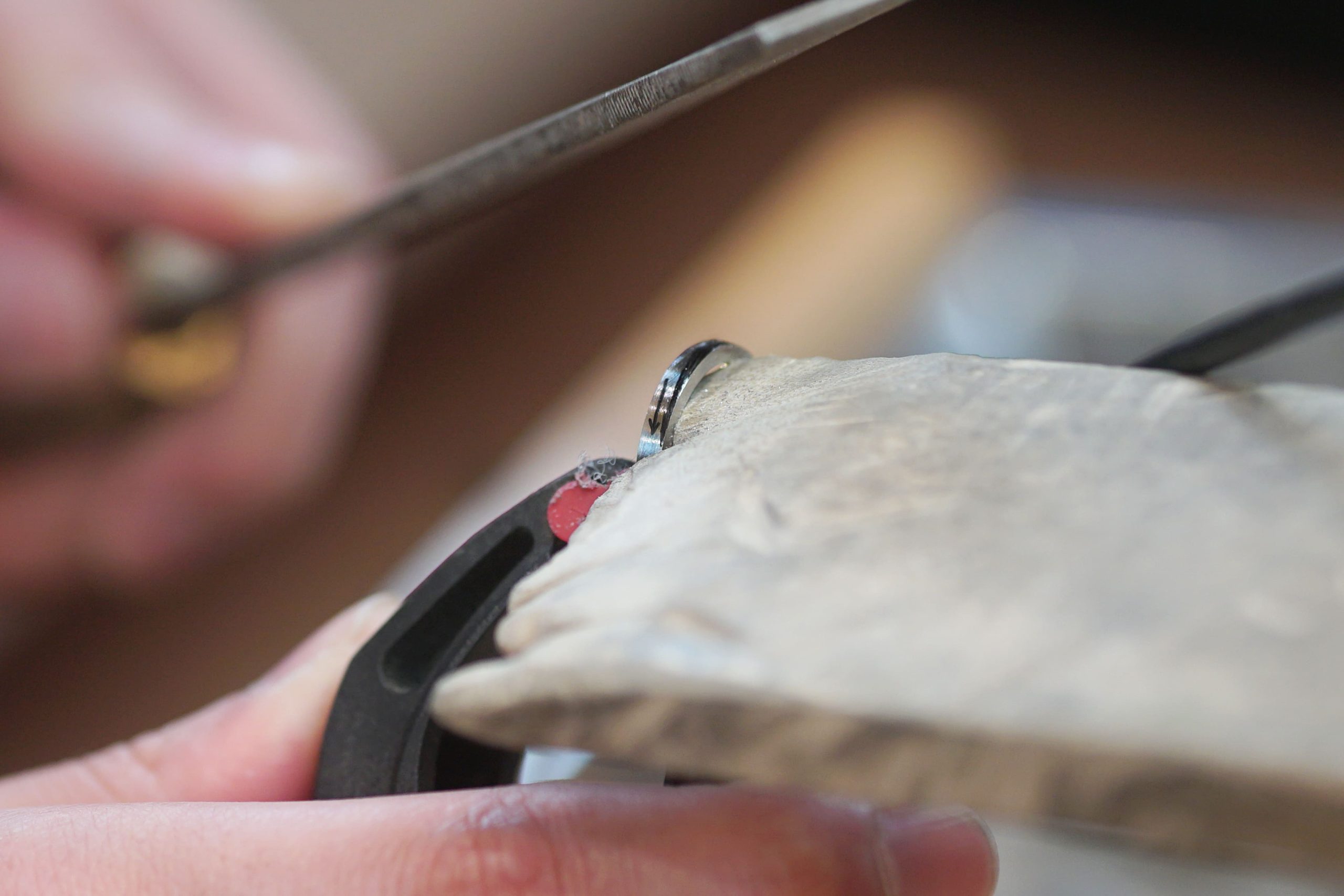指輪に削る位置や方向を描き、それに沿って削っていきます。