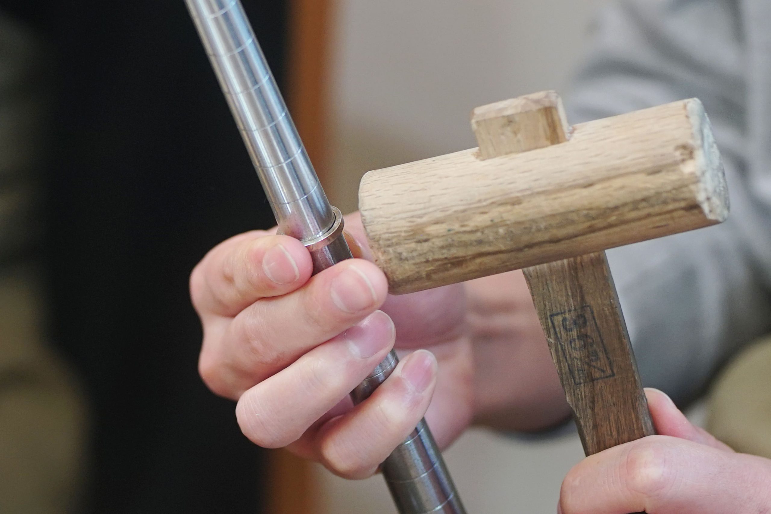 真円棒は下に行くほど太く作られているため、木槌で叩きながら下ろしていき、号数を調整します。