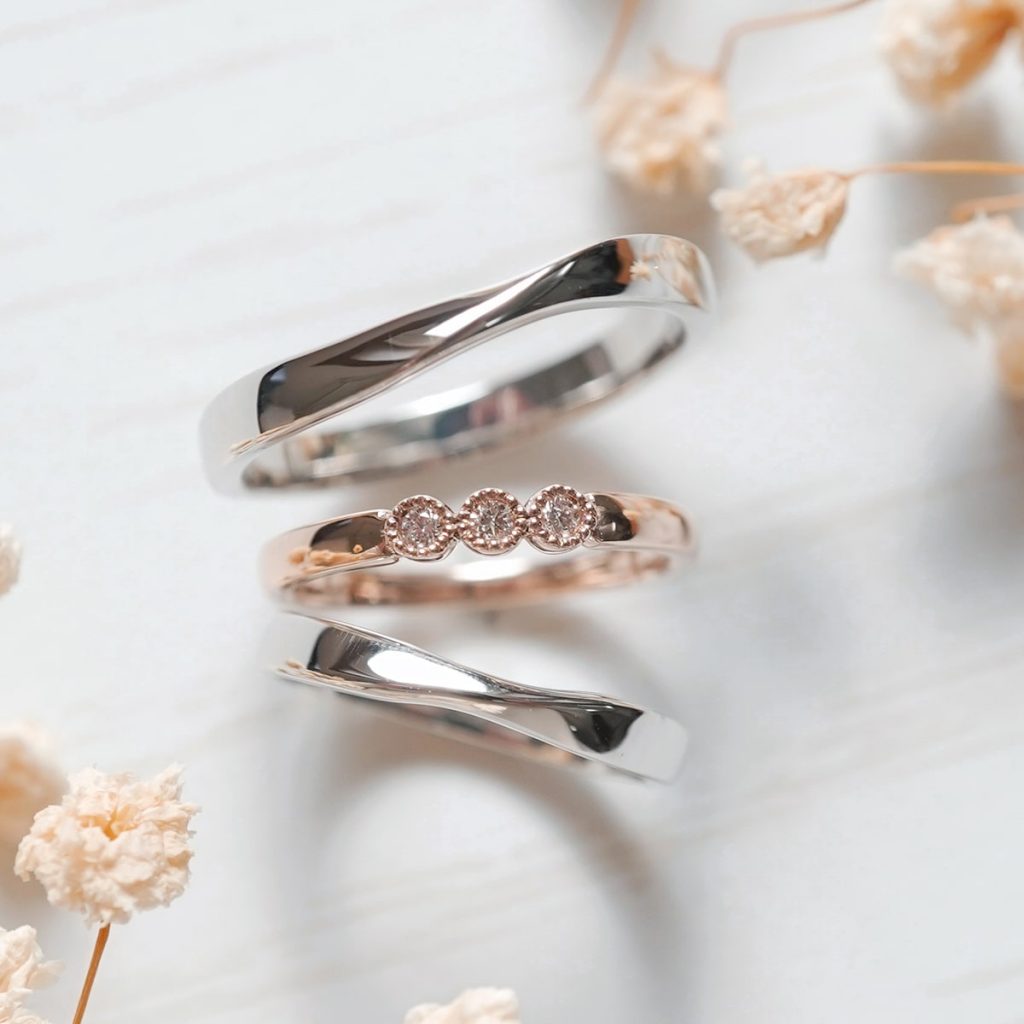 上下はひねりが加わった手作り結婚指輪、どちらもPT900素材です。 真ん中のリングは婚約指輪でオーダーメイドいただいた指輪です。素材はK18ピンクゴールド。