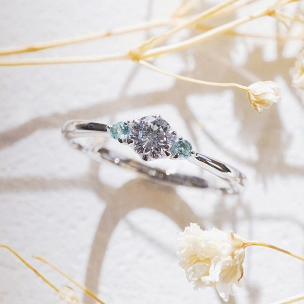 手作り婚約指輪、素材はPT900です。 両脇にはブルートパーズを留め、可愛らしく仕上げています。