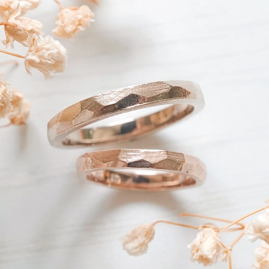 上のリングはK18シャンパンゴールド素材、下のリングはK18ピンクゴールド素材です。