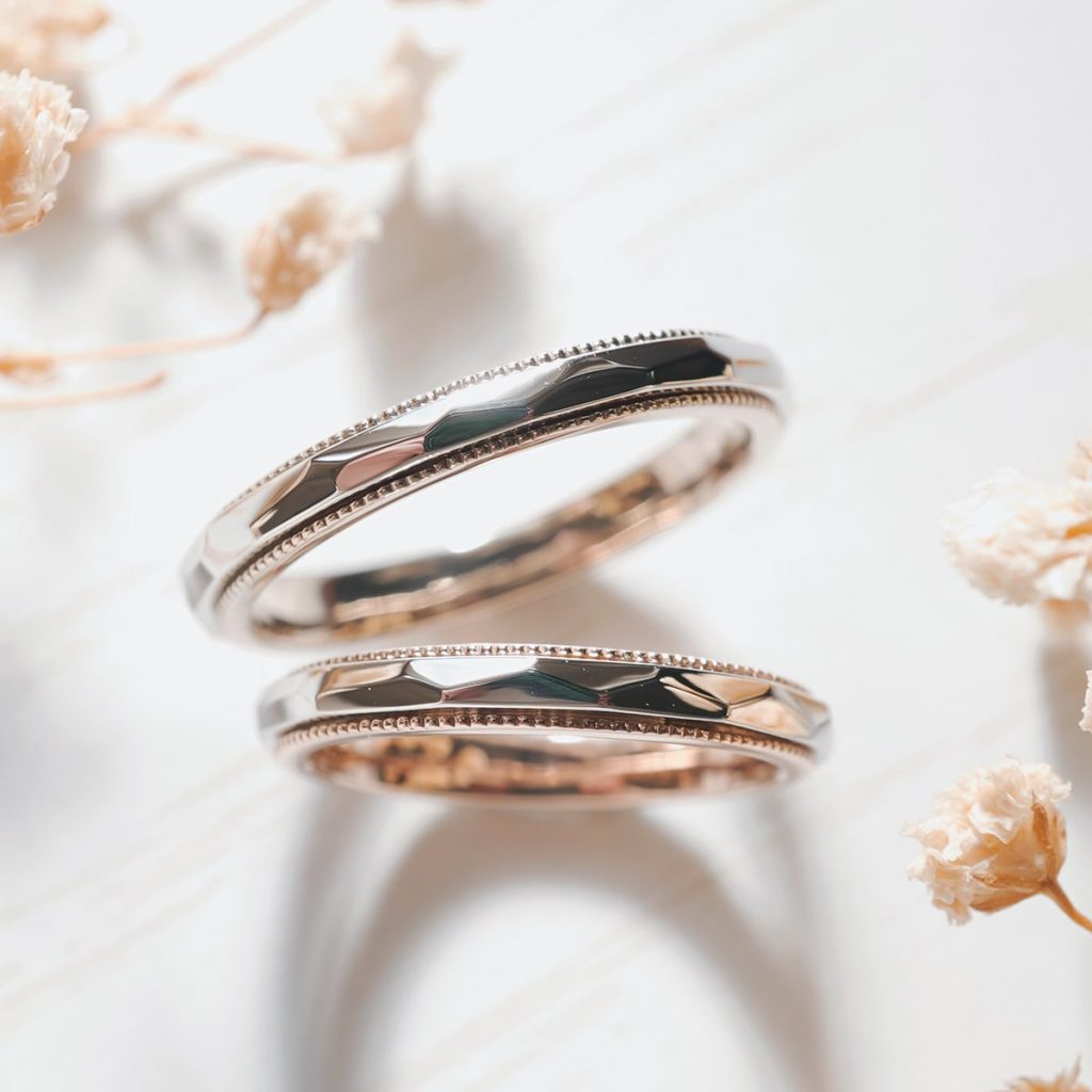 上のリングは表面がPT900,ミルグレインの枠をK18シャンパンゴールドで作製しています。