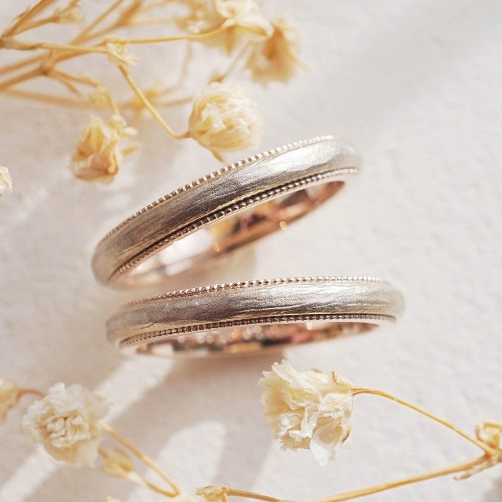 表面はK18シャンパンゴールド、ミルグレインの枠はK18ピンクゴールドで作製いただきました。