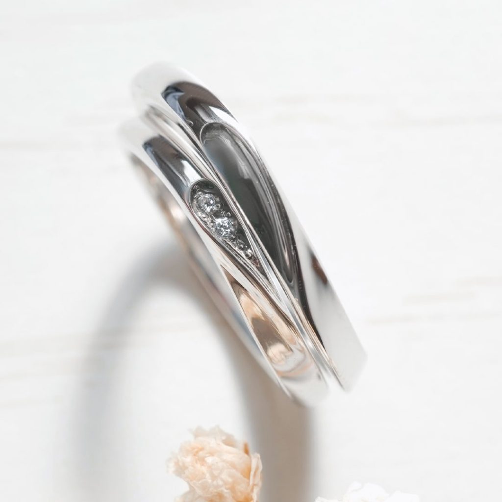 ハート型の結婚指輪、どちらも素材はPT950で作製いただきました。 左のリングはダイヤモンドを2石留めています。 重なるとハートが浮かび上がる可愛いリングデザインです。