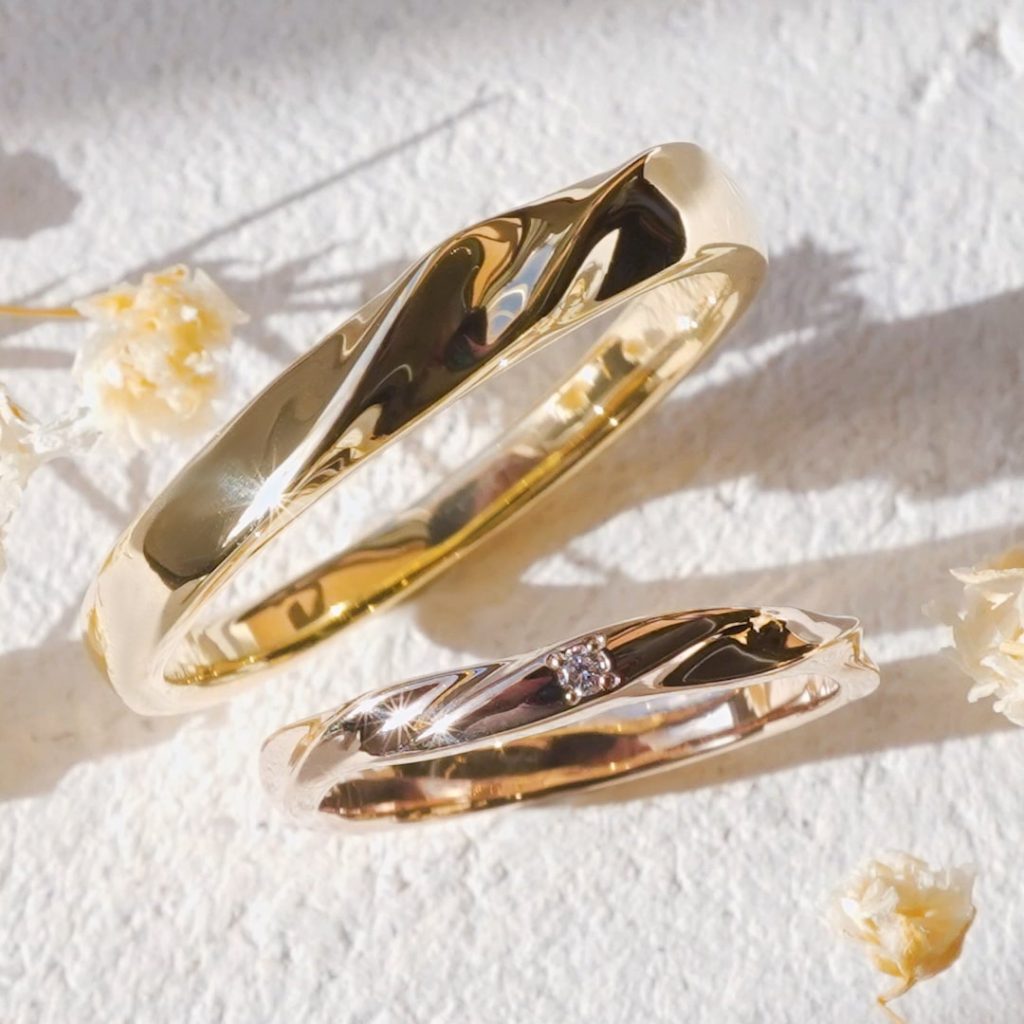 上のリングはK18イエローゴールド素材、下のリングはK18ピンクゴールド素材です。 下のリングはダイヤモンドを1石加えています。