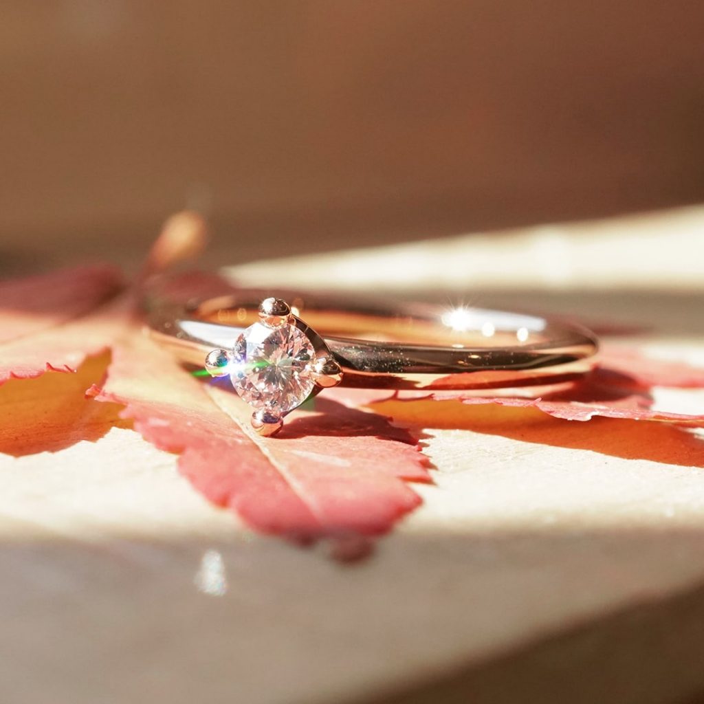 シンプルなストレート形状の婚約指輪。 素材はK18ピンクゴールド素材。どんな結婚指輪にも合わせやすいベーシックな形です。