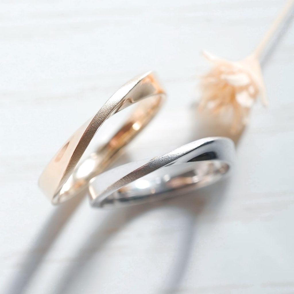 上のリングはK18イエローゴールド素材、下のリングはPT900素材です。