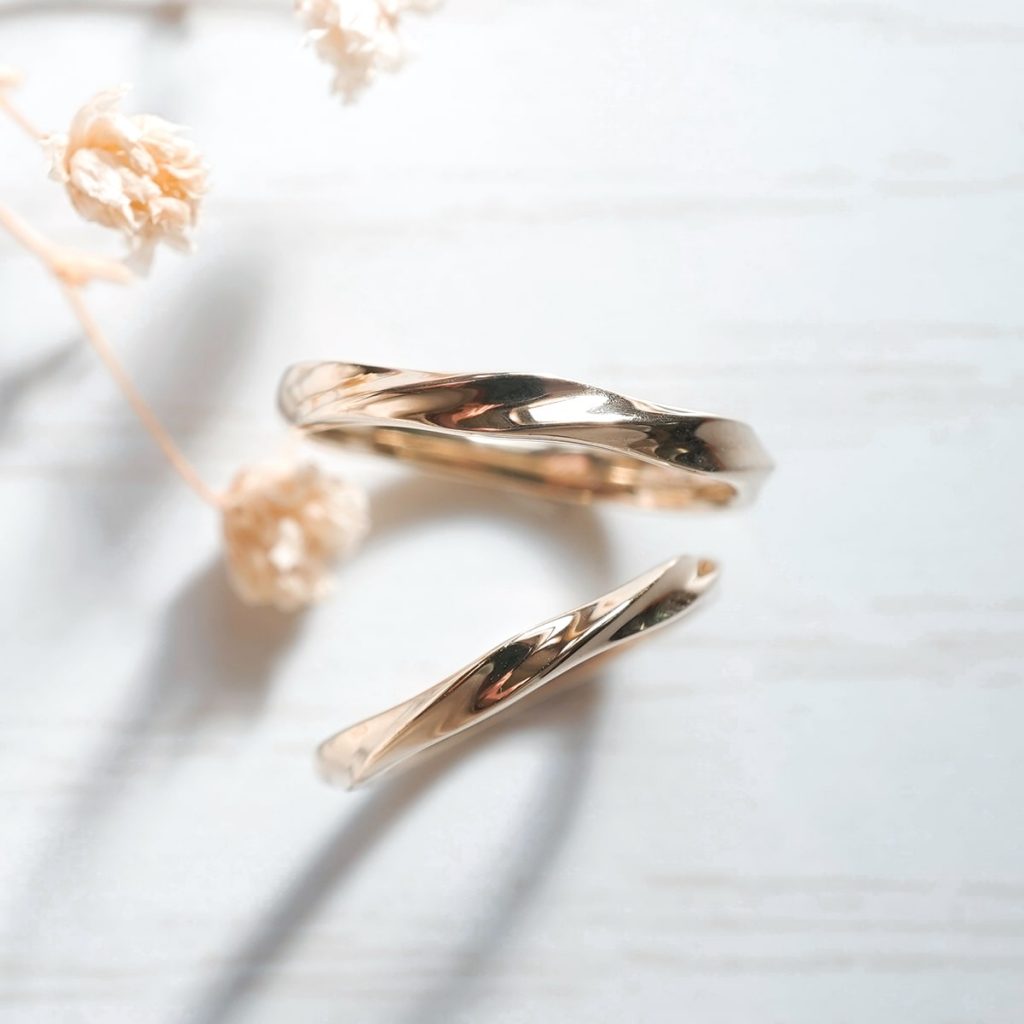 どちらもK18イエローゴールド素材です。 ひねりを4面加えたスタイリッシュな指輪です。 全面鏡面仕上げ。